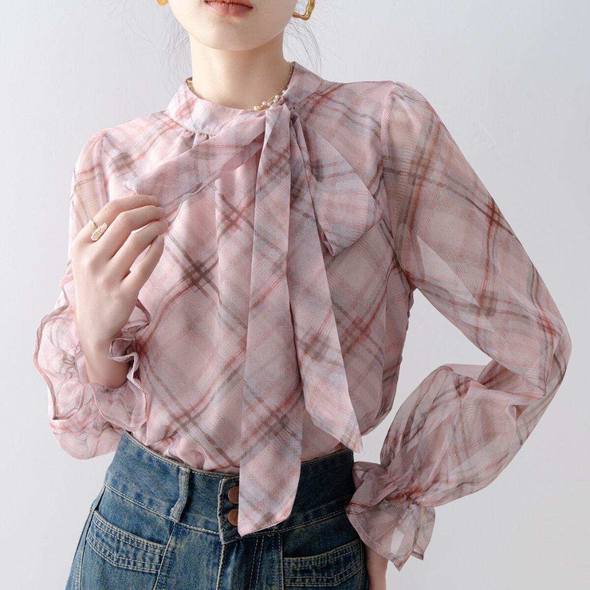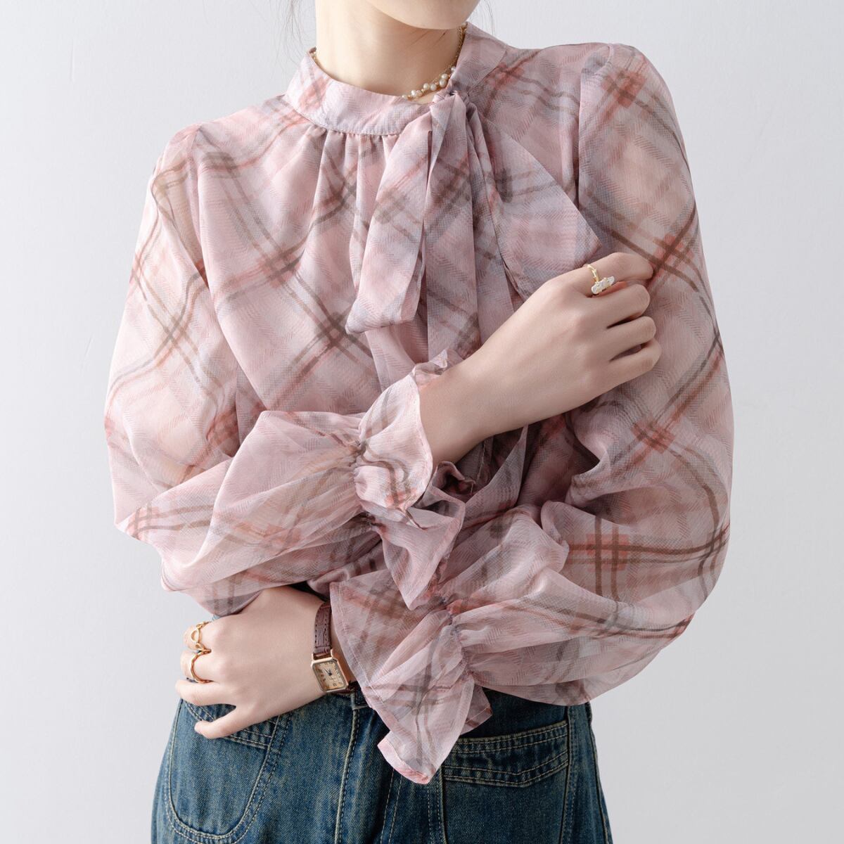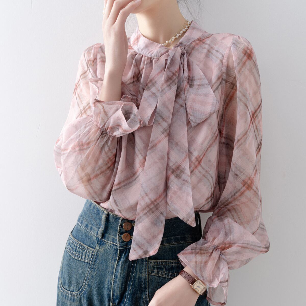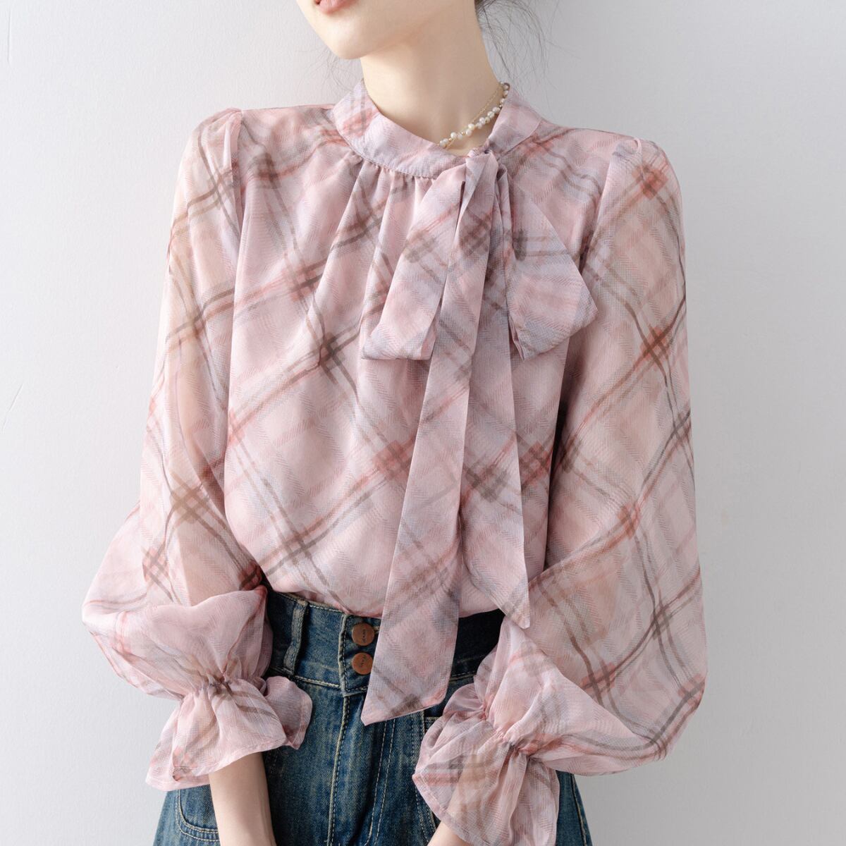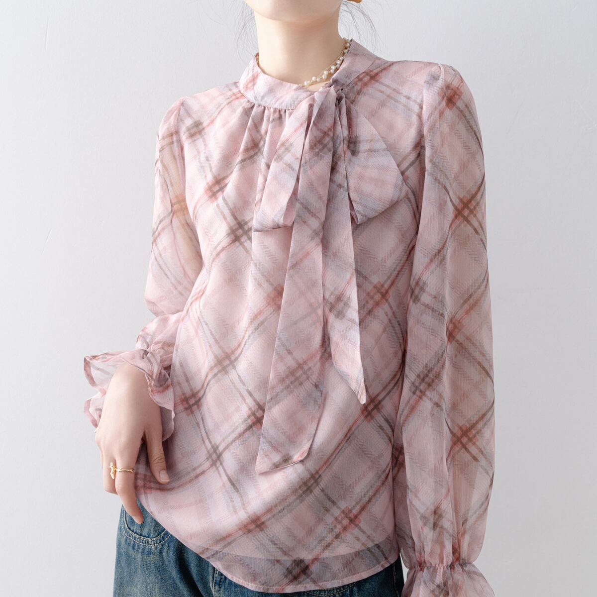 上品で柔らかな印象を与える、チェック柄のボウタイブラウス。