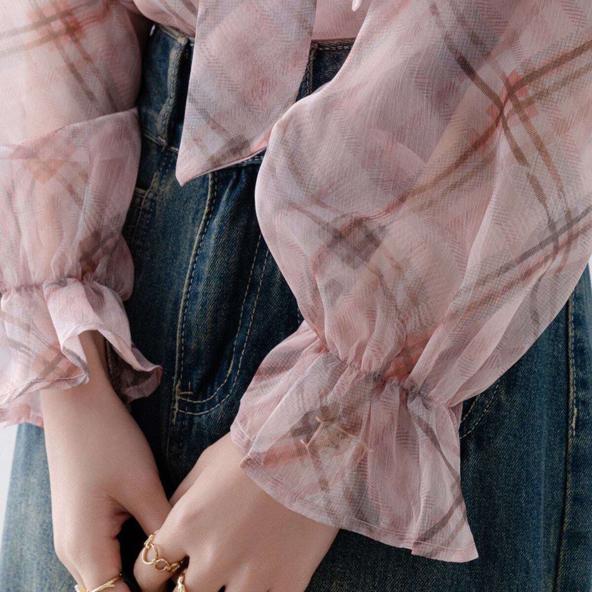 ほんのり透け感のあるシフォン素材が、女性らしさと軽やかさを演出します。