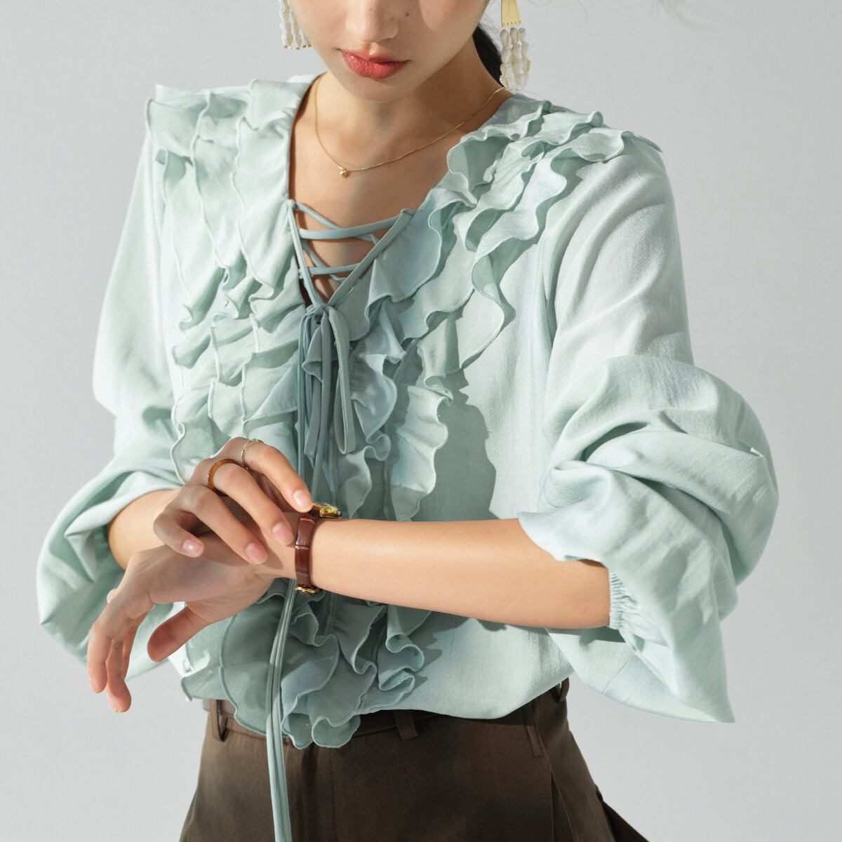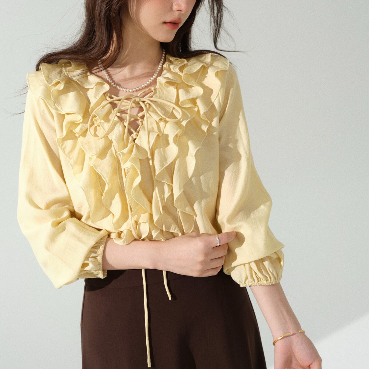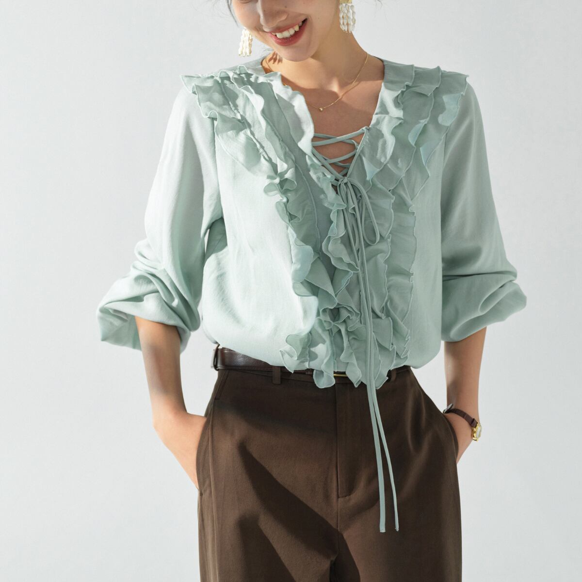 軽やかに揺れるフリルが華やかな印象を与える、レースアップデザインのブラウス。