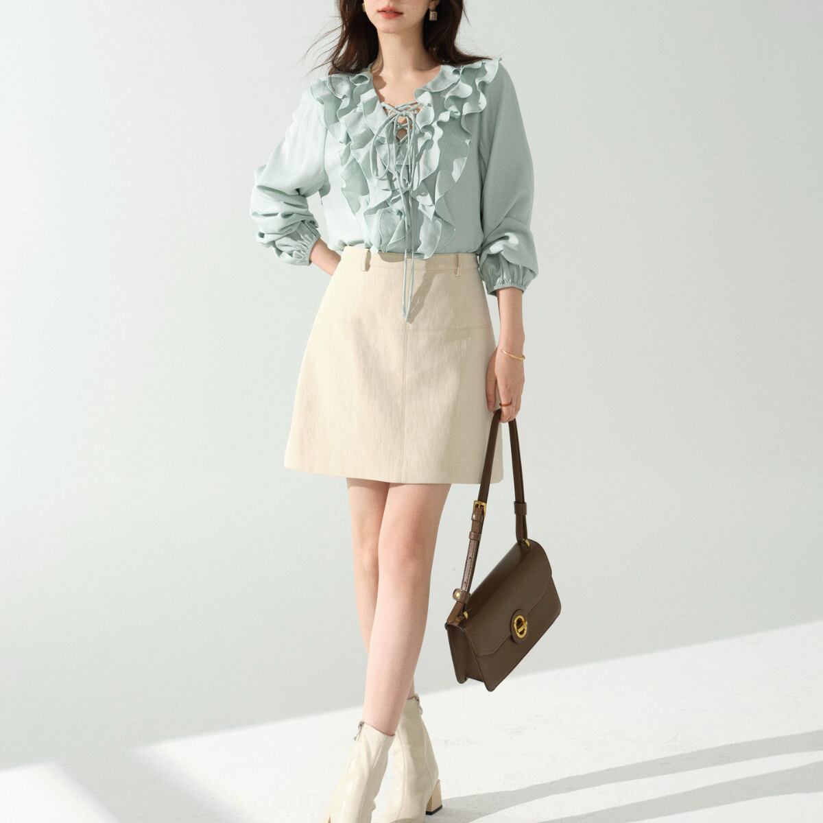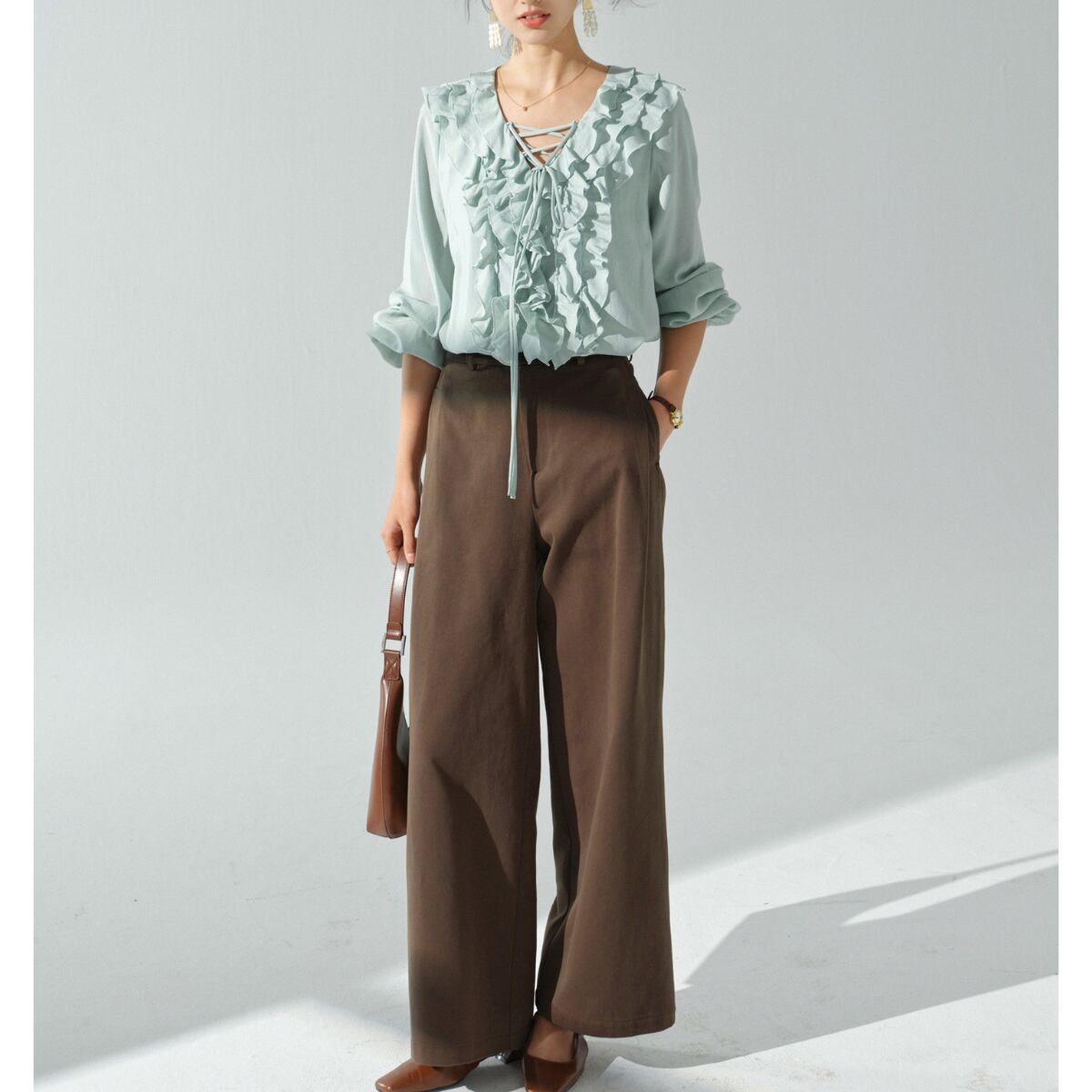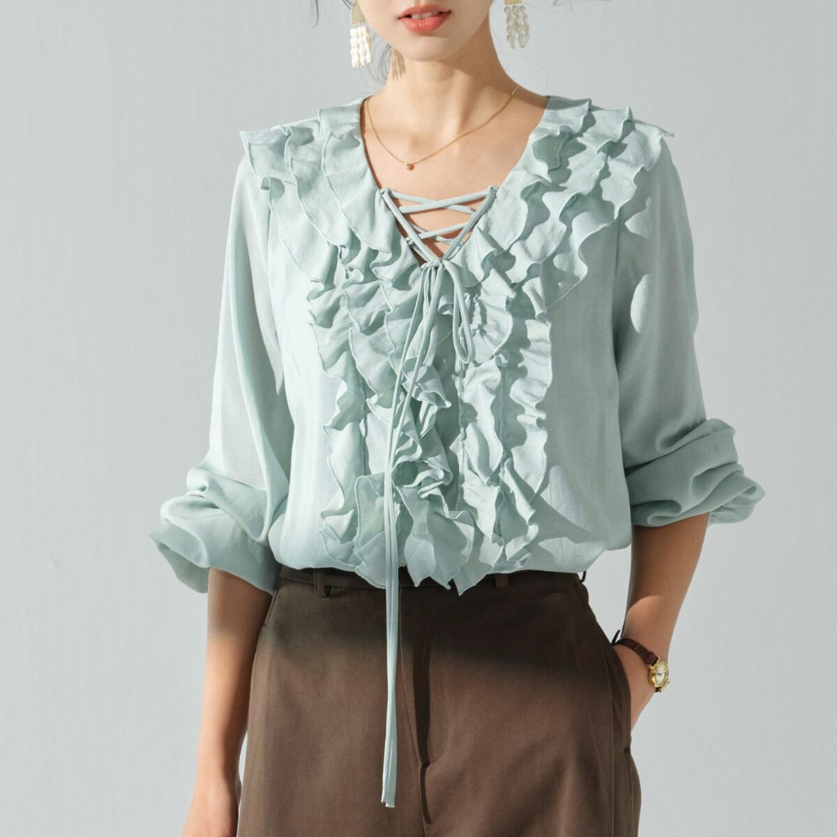 軽やかに揺れるフリルが華やかな印象を与える、レースアップデザインのブラウス。