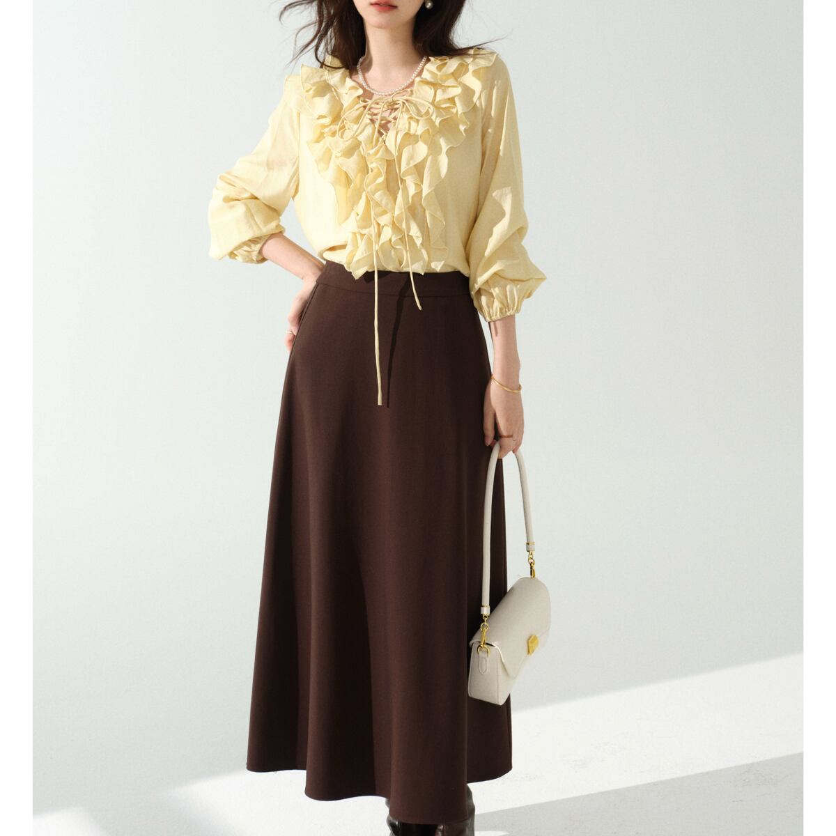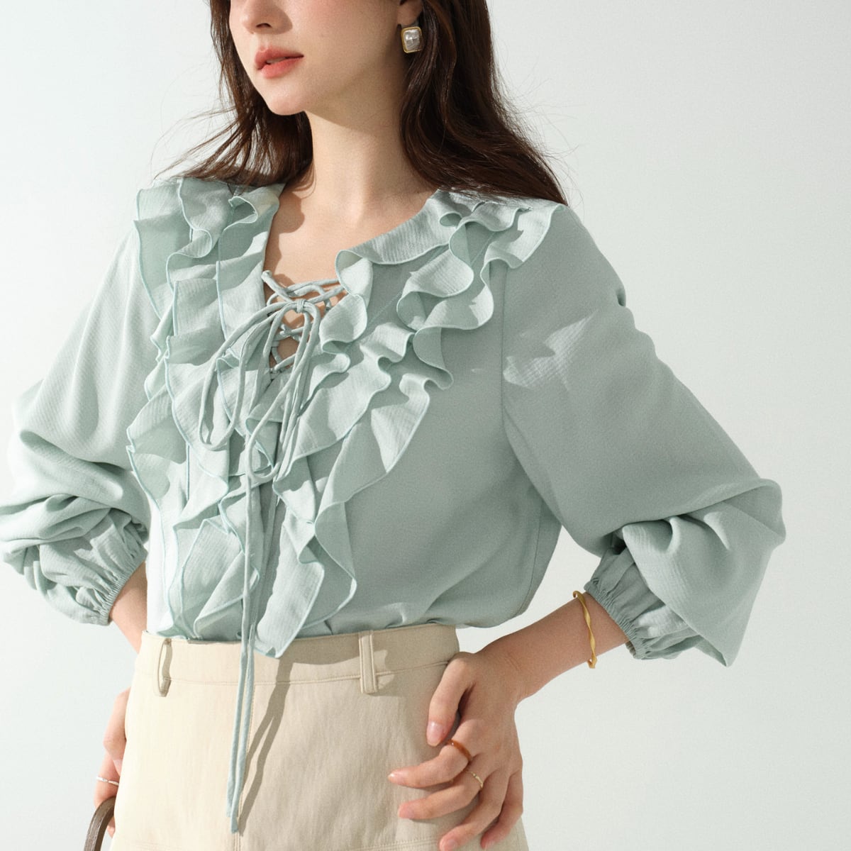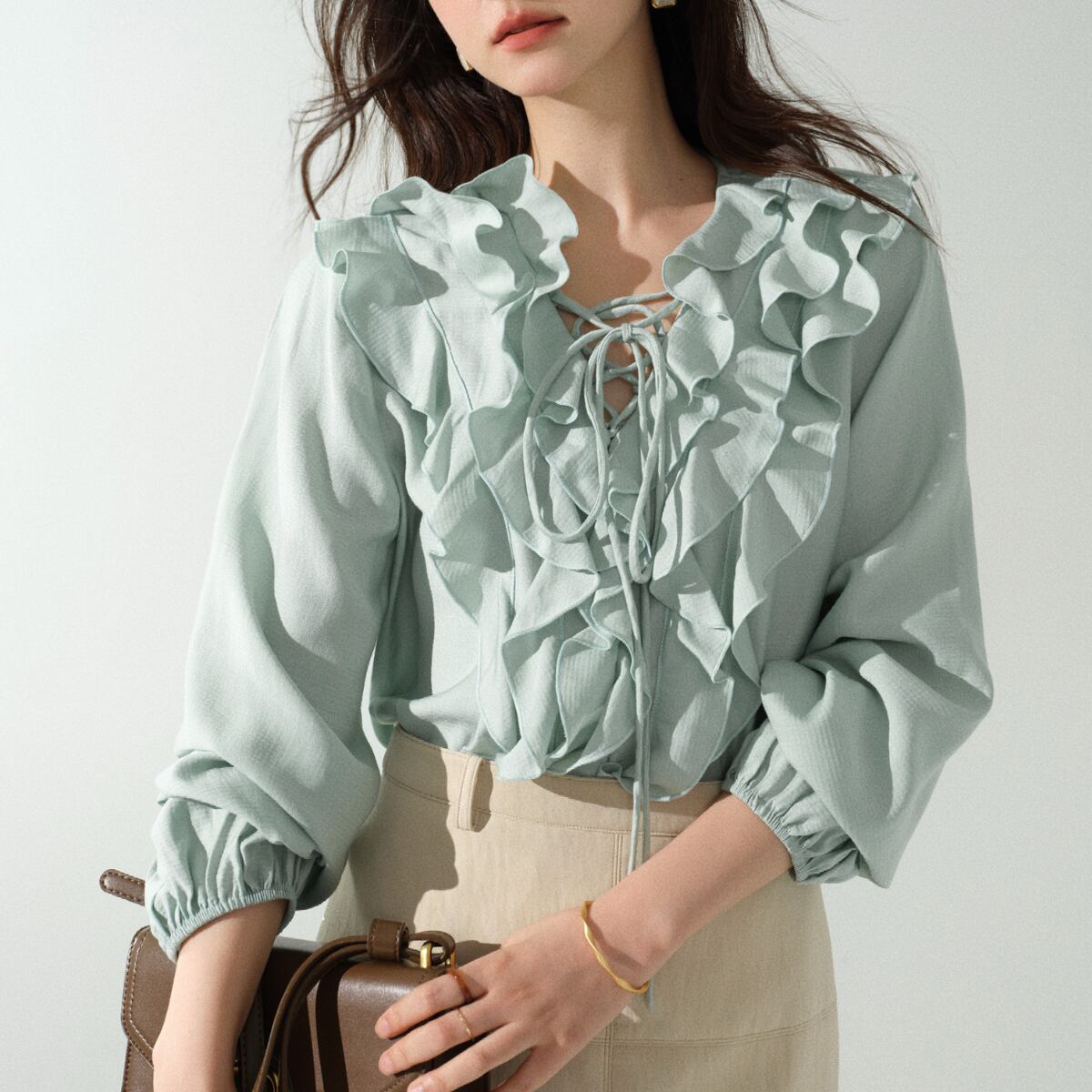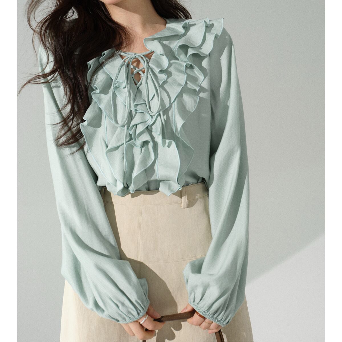 フロントのレースアップデザインが程よい抜け感をプラスし、甘さの中にさりげない大人っぽさを演出。ふんわりとしたボリュームスリーブとギャザーカフスが、上品でこなれたシルエットを叶えます。