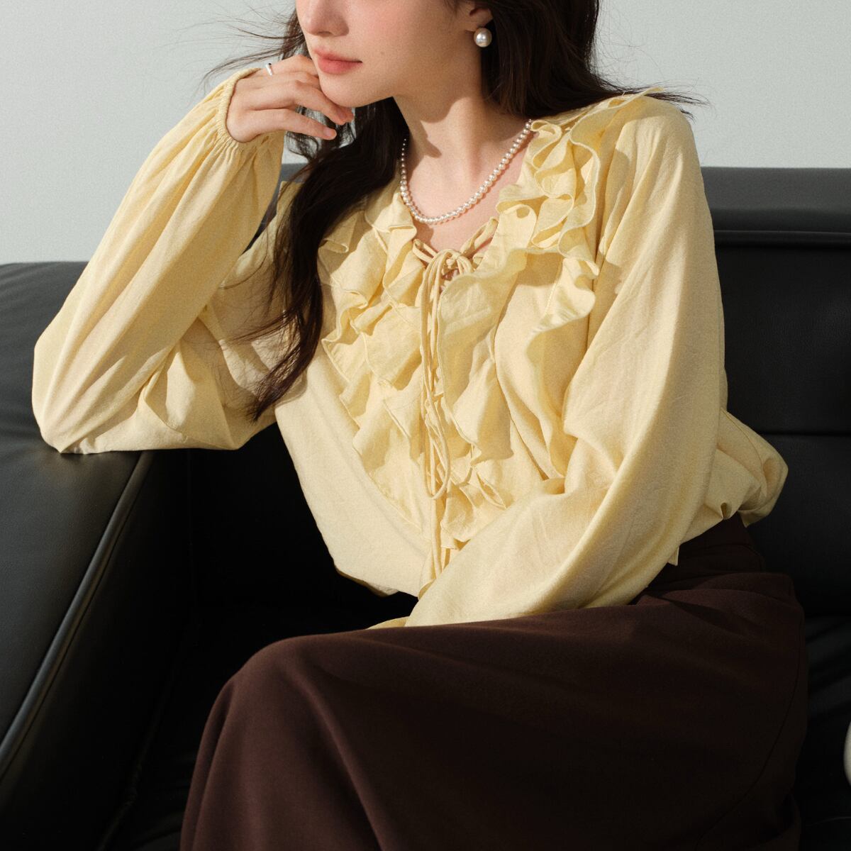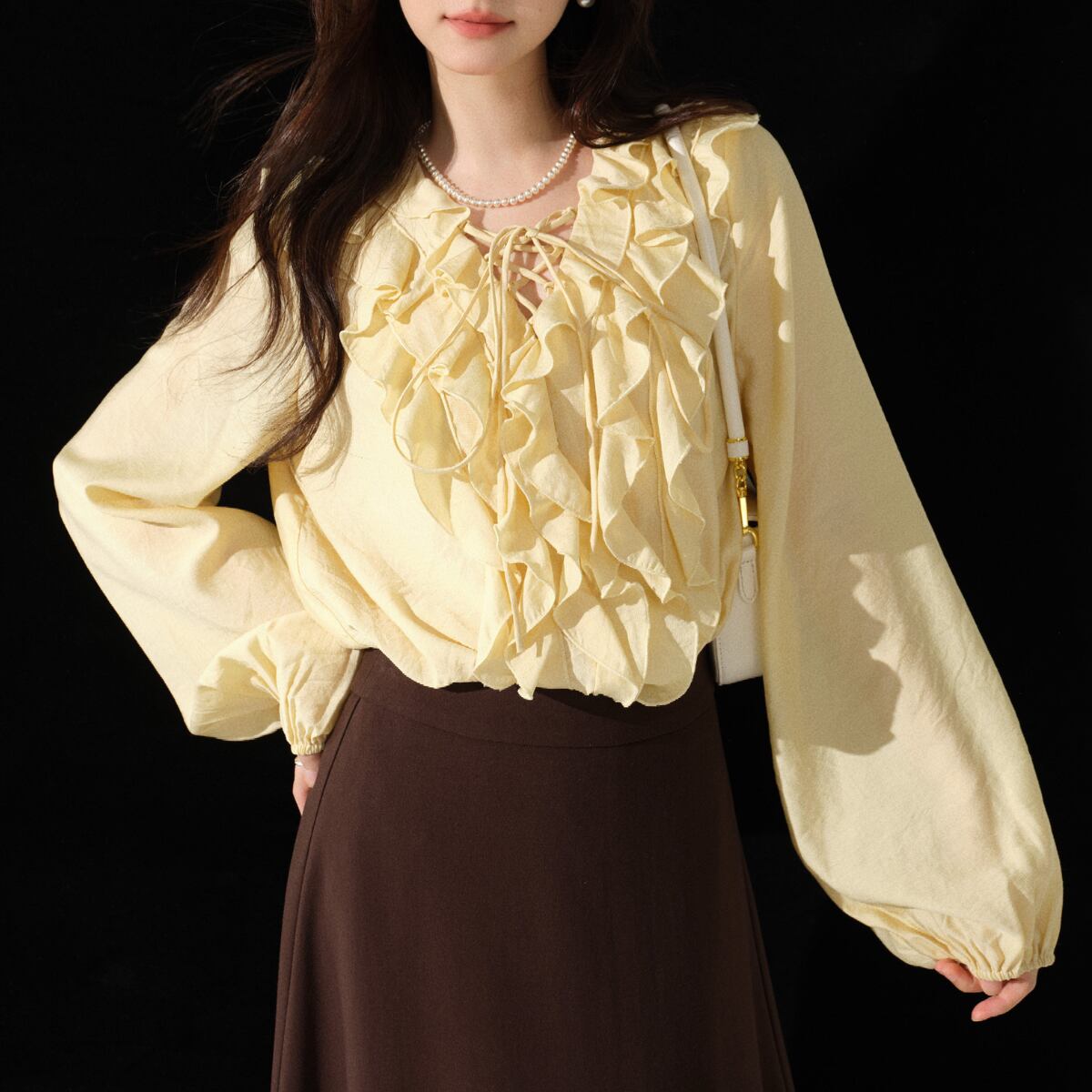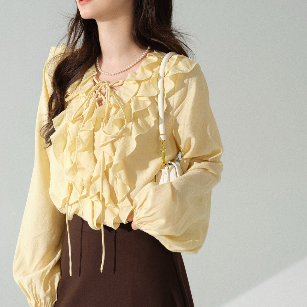 立体感のあるラッフルフリルが顔まわりを美しく演出し、女性らしい柔らかな雰囲気を引き立てます。