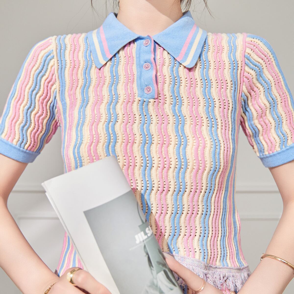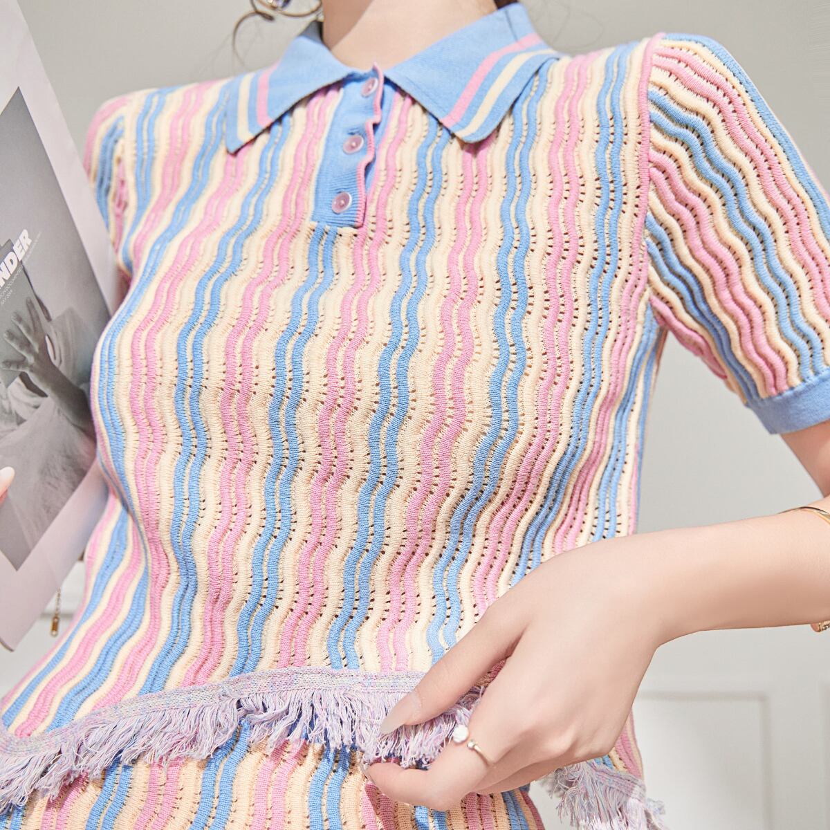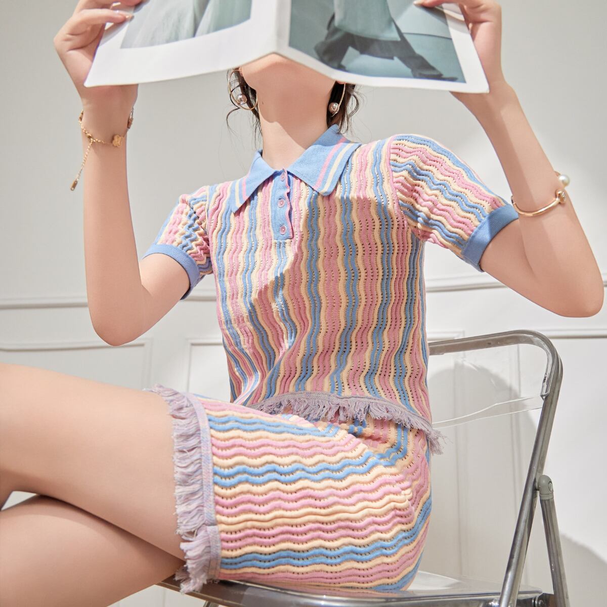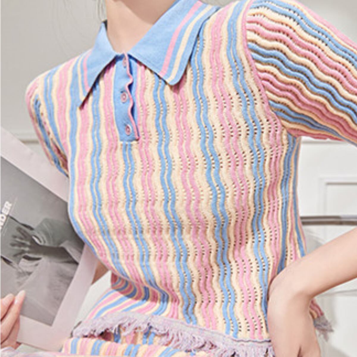 柔らかなパステルカラーが目を惹く、ニット素材のポロトップス&スカートのセットアップ。ピンク・ブルー・イエローを織り交ぜた繊細なマルチボーダーが、華やかさと上品さを絶妙なバランスで演出します。