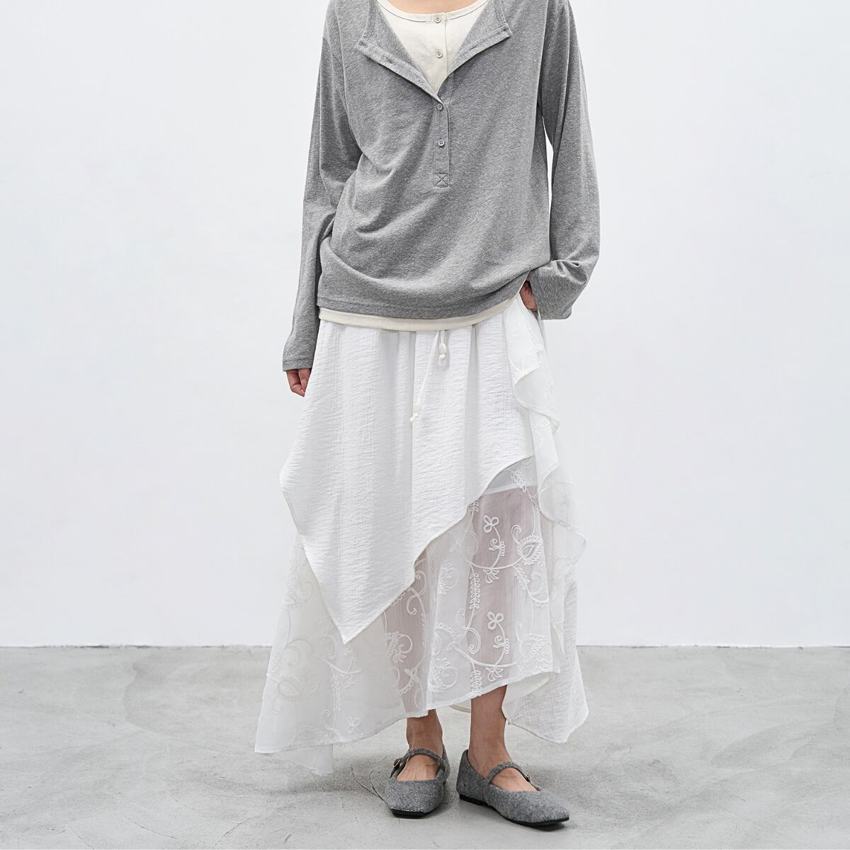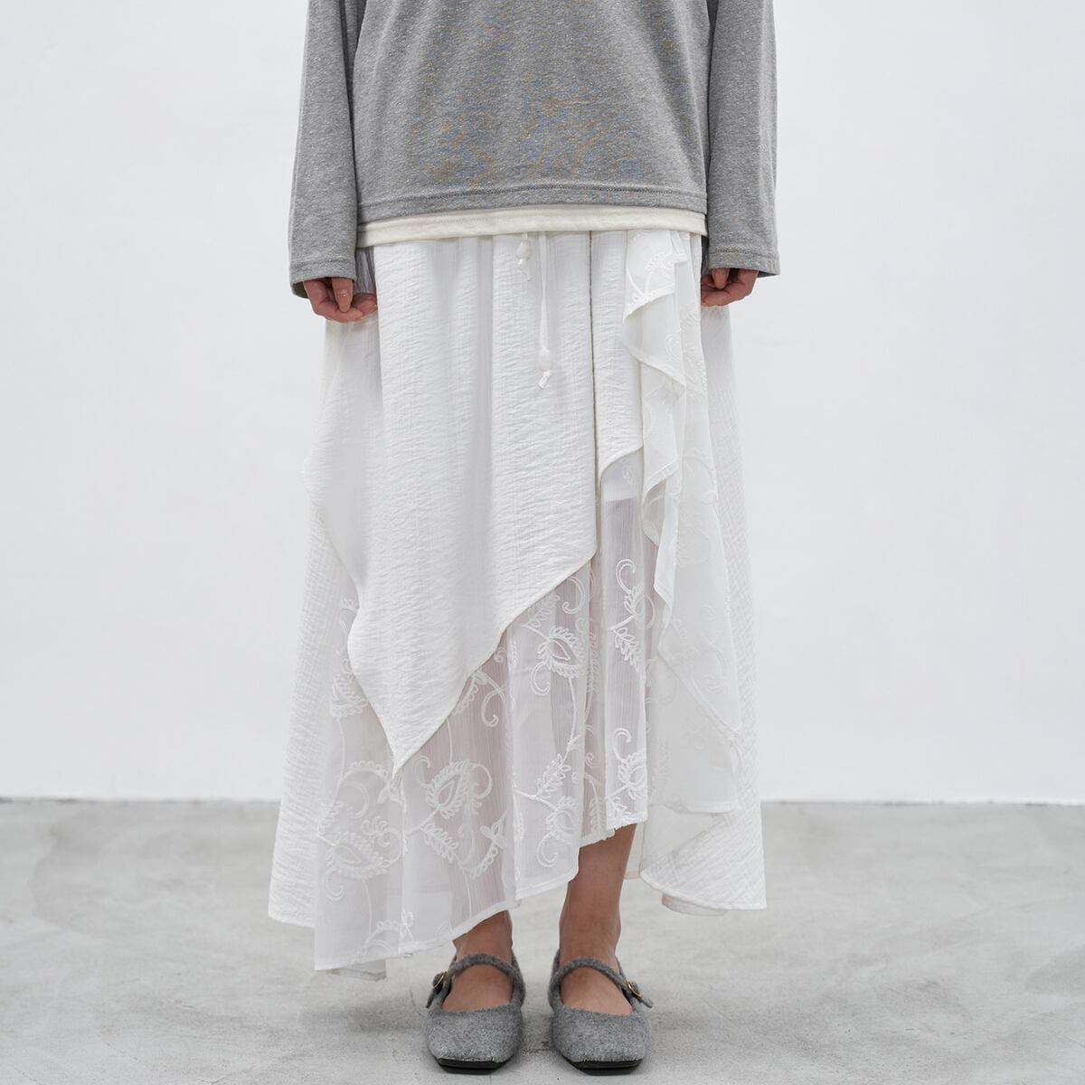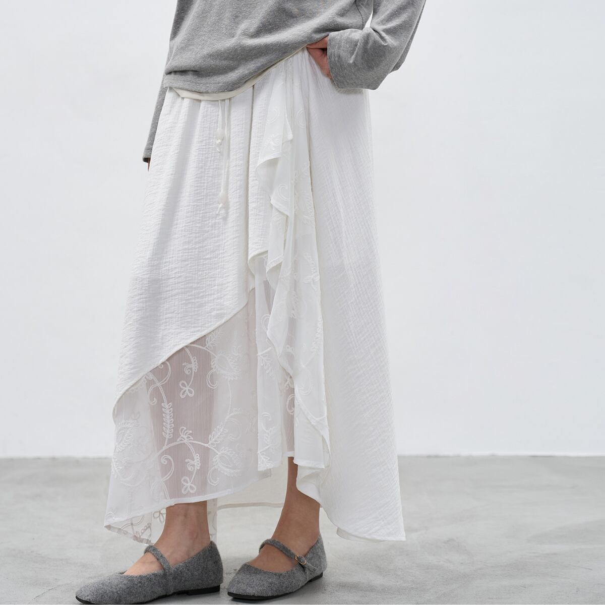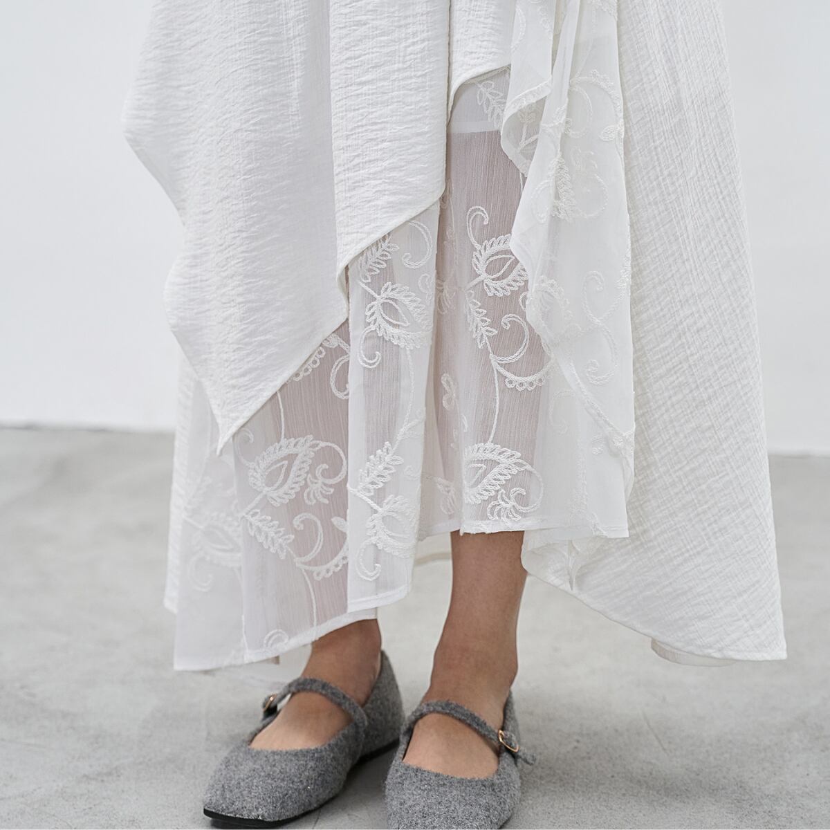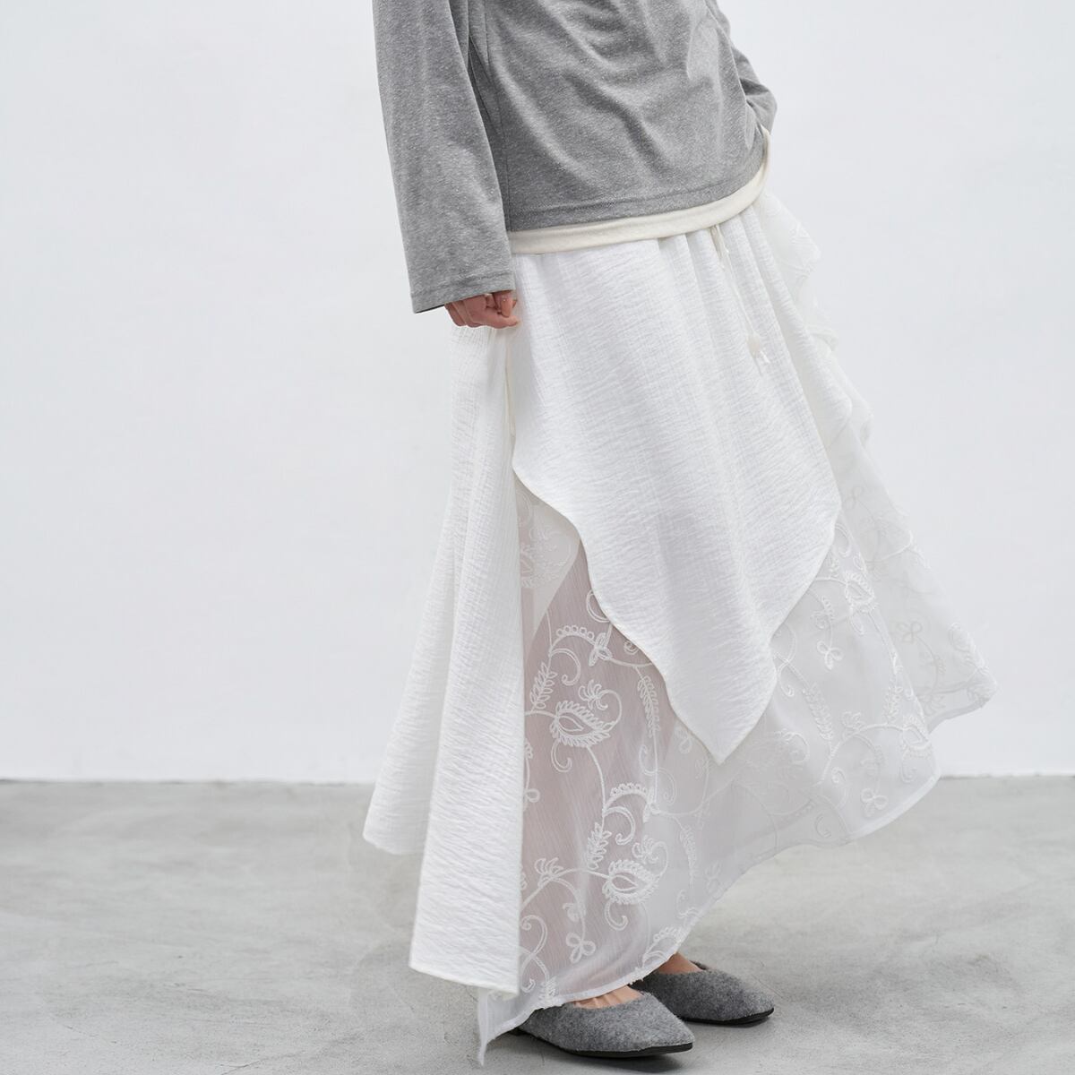 軽やかなシアー素材と繊細な刺繍を重ねた、上品な存在感を放つレイヤードマキシスカート。