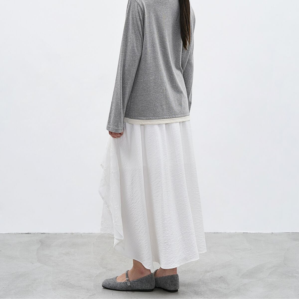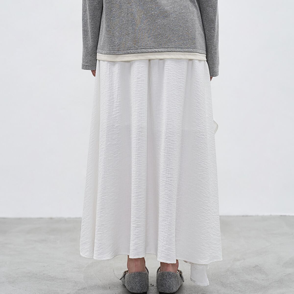 アシンメトリーに重なり合うデザインが、歩くたびに優雅な揺れ感を生み出し、自然体でありながら印象的なスタイルを演出します。
