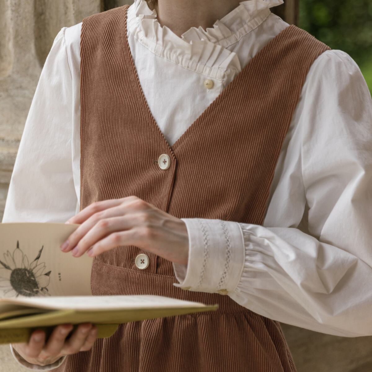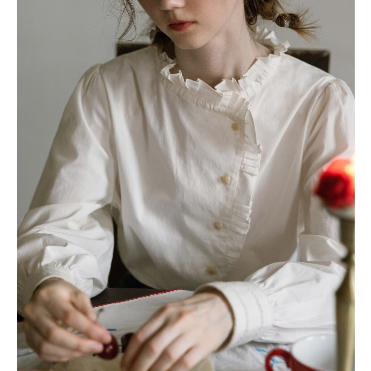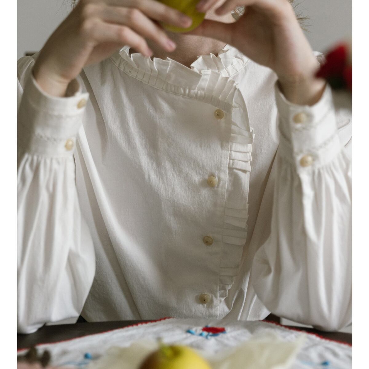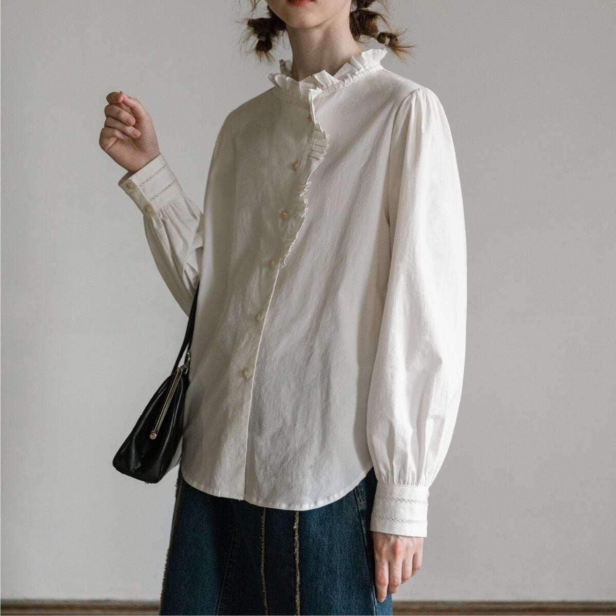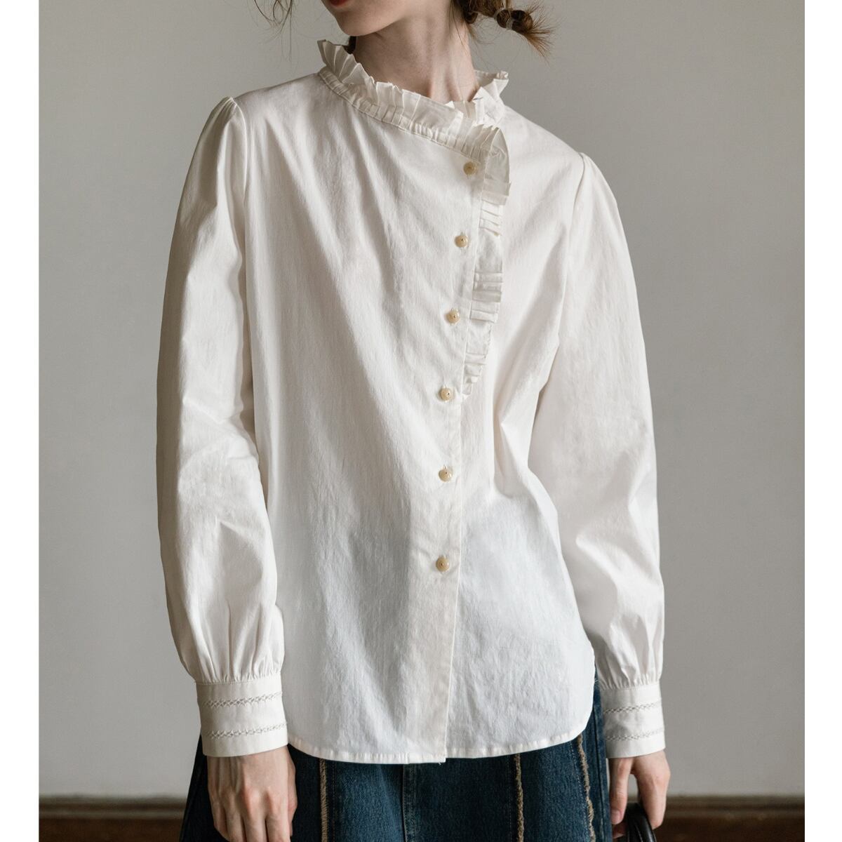 繊細なフリルをあしらったスタンドカラーが印象的な、クラシカルムード漂うブラウス。フロントはさりげないフリルディテールと柔らかな丸ボタンで上品に仕上げ、袖は程よいボリューム感で女性らしいシルエットを演出します。