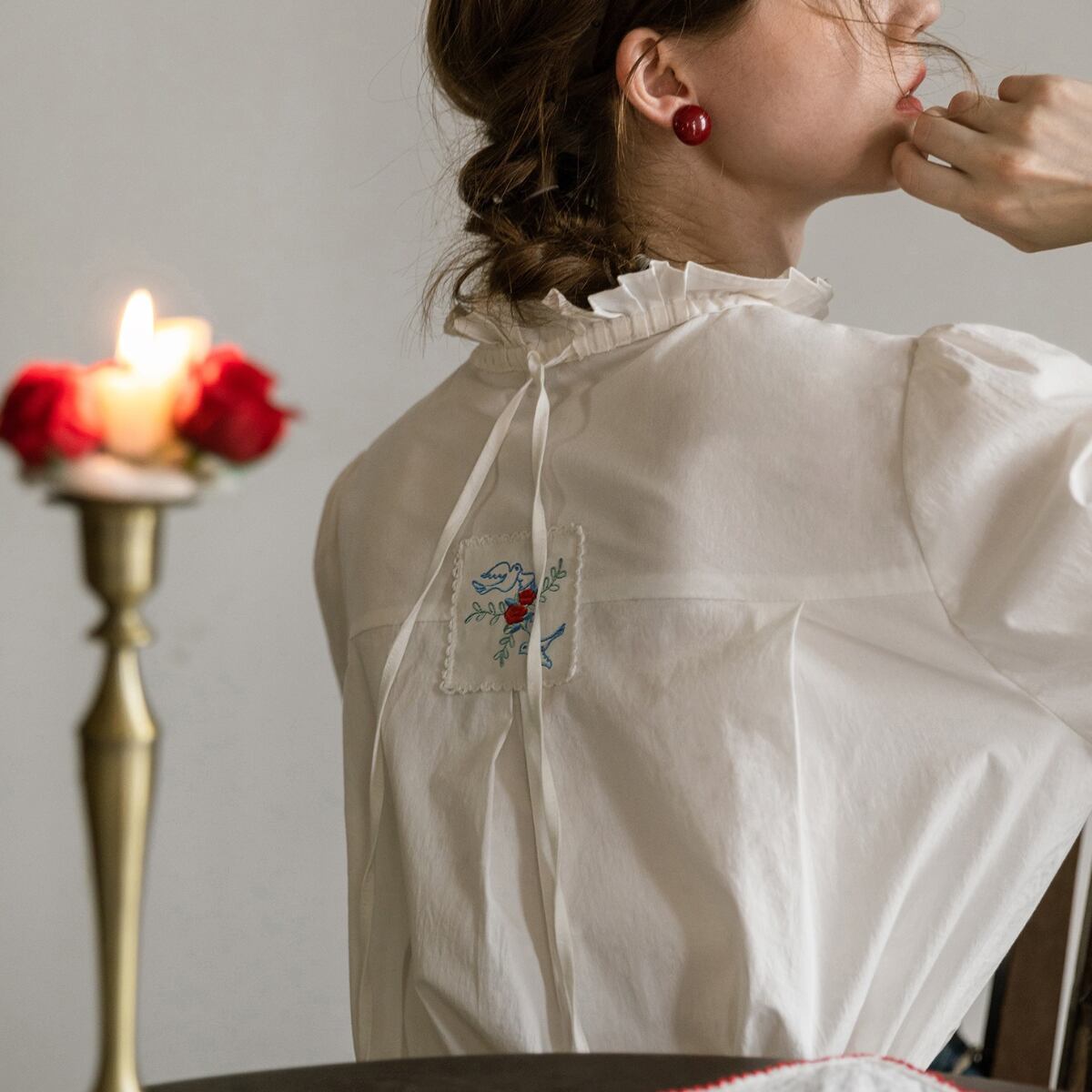 バックリボン刺繍パッチ フリルスタンドカラーブラウス ch0004