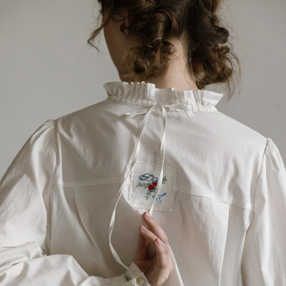 バックスタイルには、小鳥とフラワーモチーフの刺繍パッチをあしらい、後ろ姿まで抜かりないデザインに。華奢なリボンが揺れ、さりげない可憐さをプラスします。