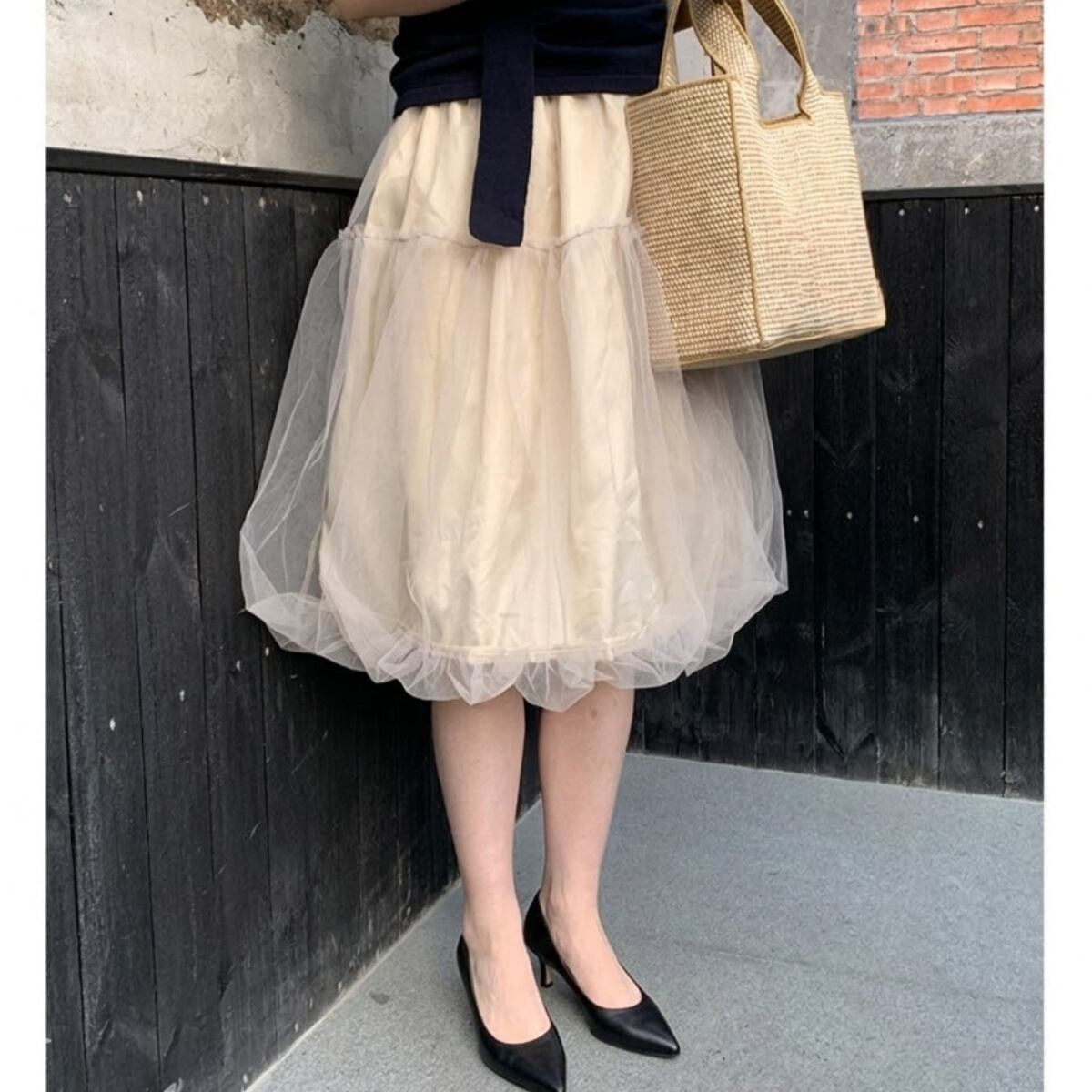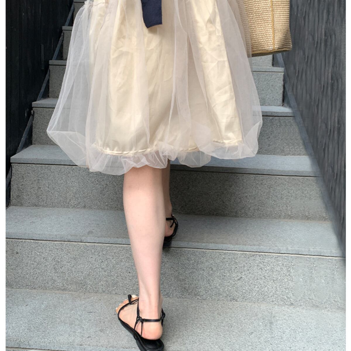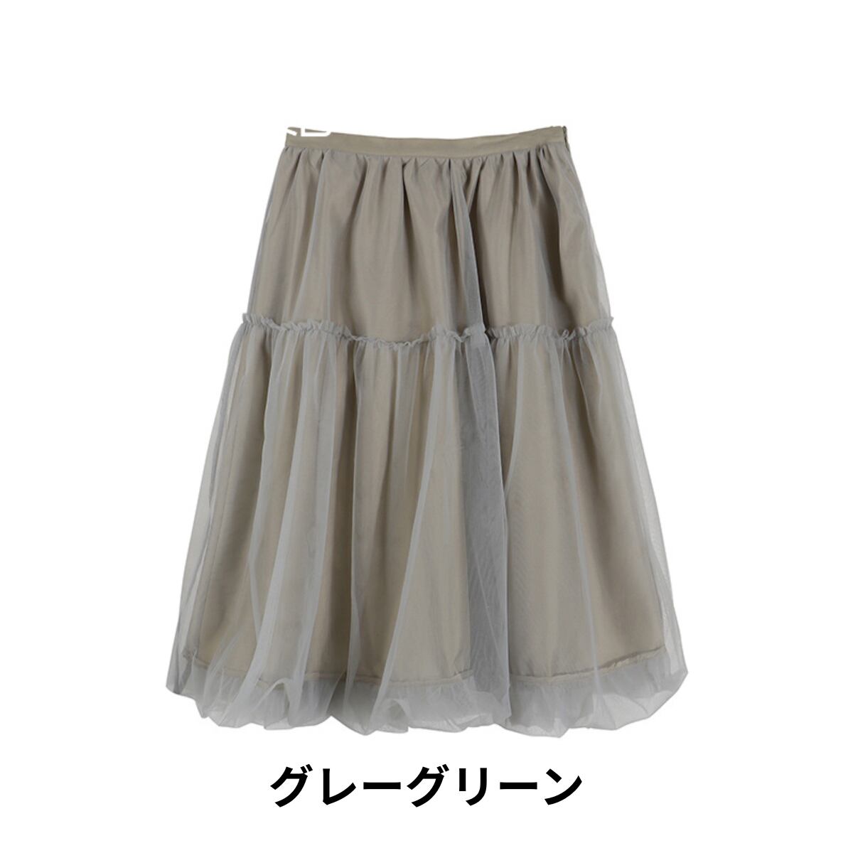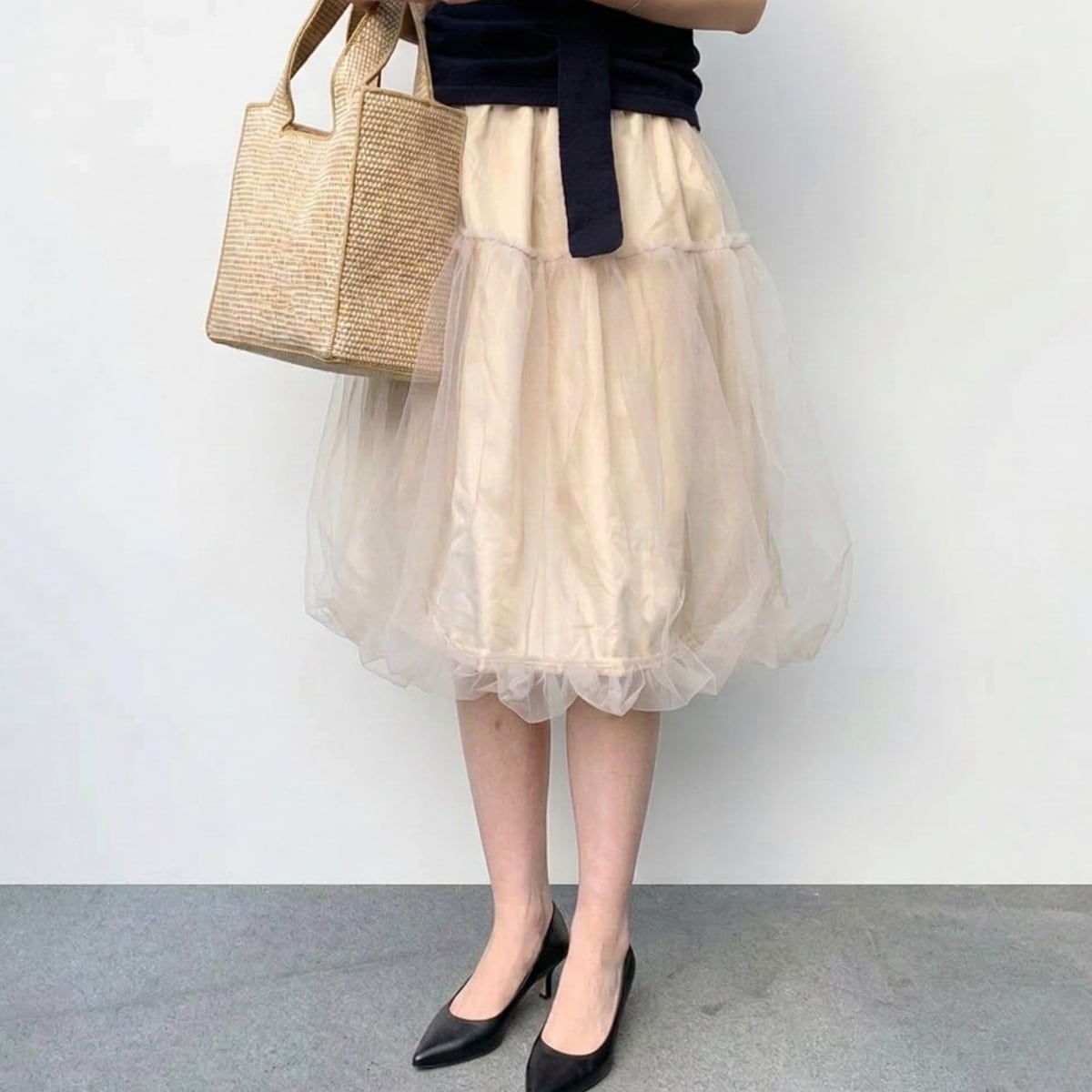 繊細なチュールを贅沢に重ね、裾にボリュームを持たせることで脚を細見えさせてくれる嬉しい効果も。内側から覗く上品な光沢生地が、奥行きのある華やかさをプラスします。