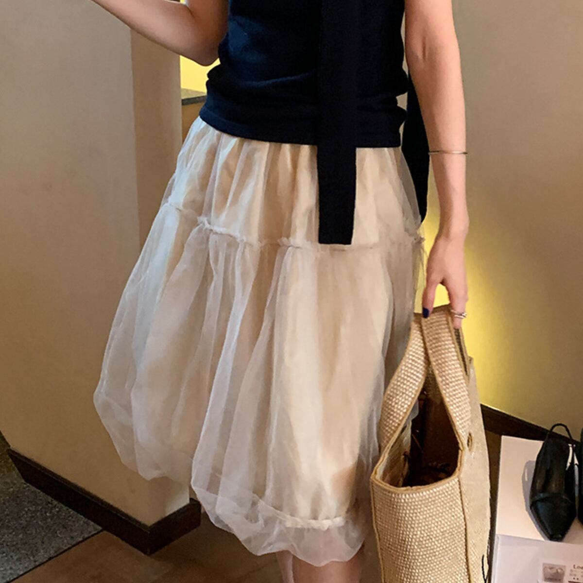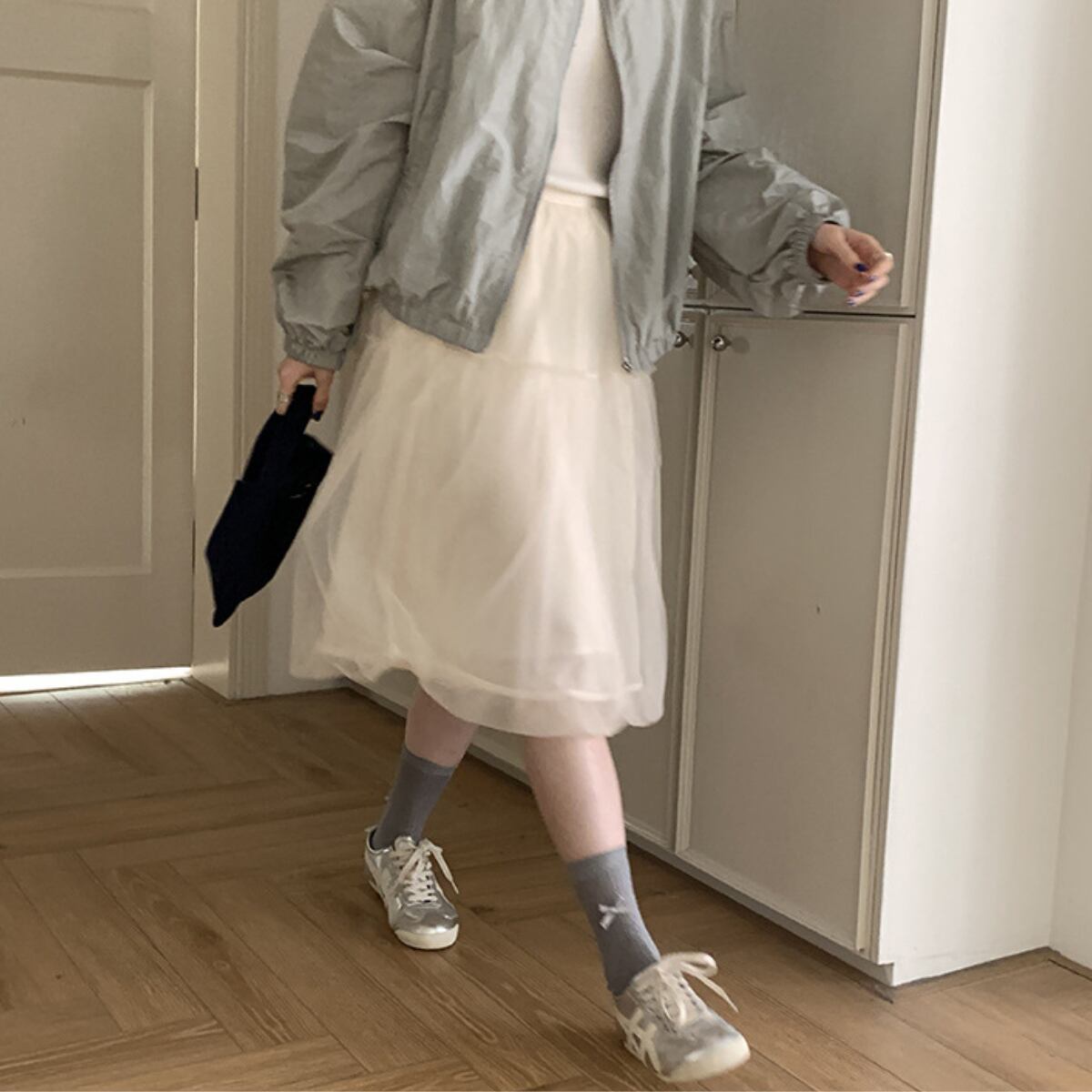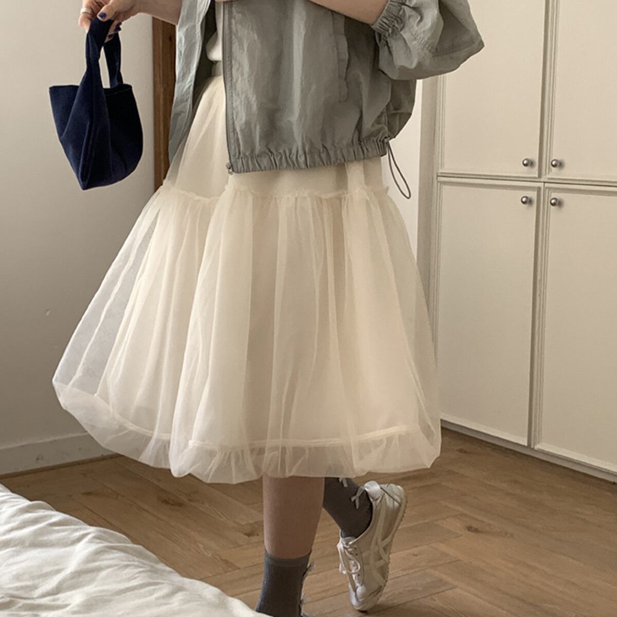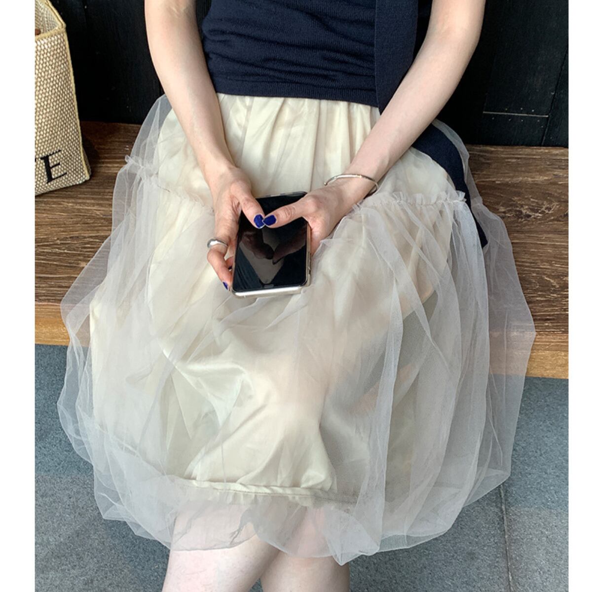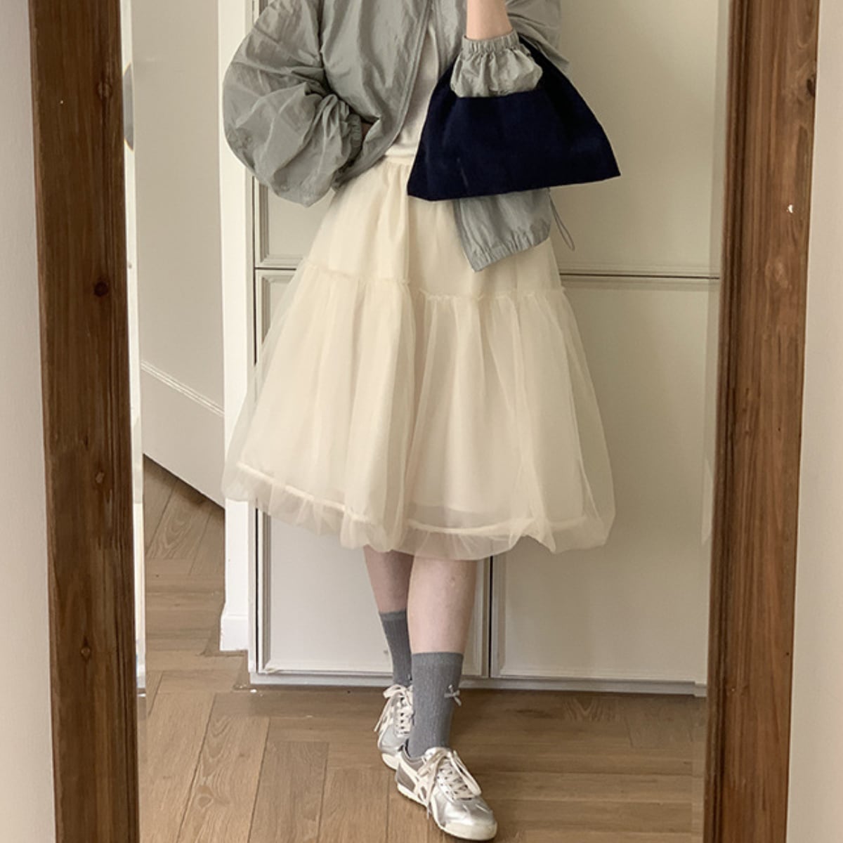 繊細なチュールを贅沢に重ね、裾にボリュームを持たせることで脚を細見えさせてくれる嬉しい効果も。内側から覗く上品な光沢生地が、奥行きのある華やかさをプラスします。