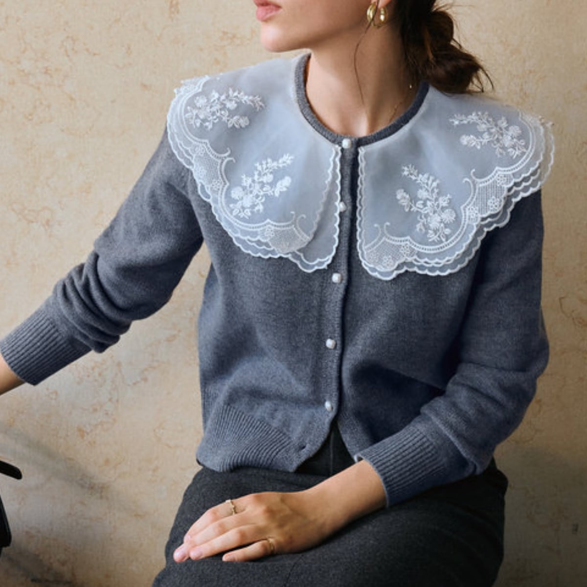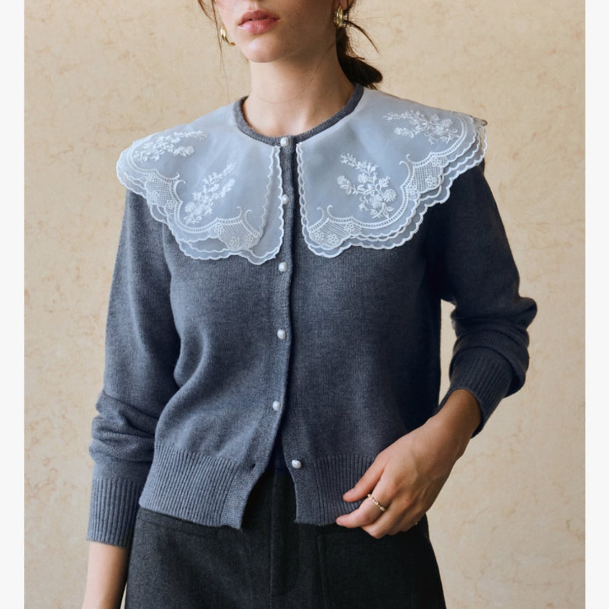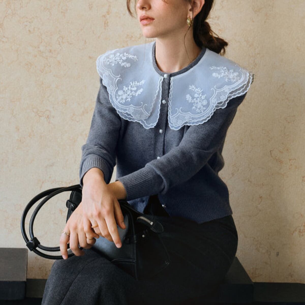 透け感のある大ぶりな襟が、重くなりがちな冬の装いに軽やかな抜け感をプラスします。