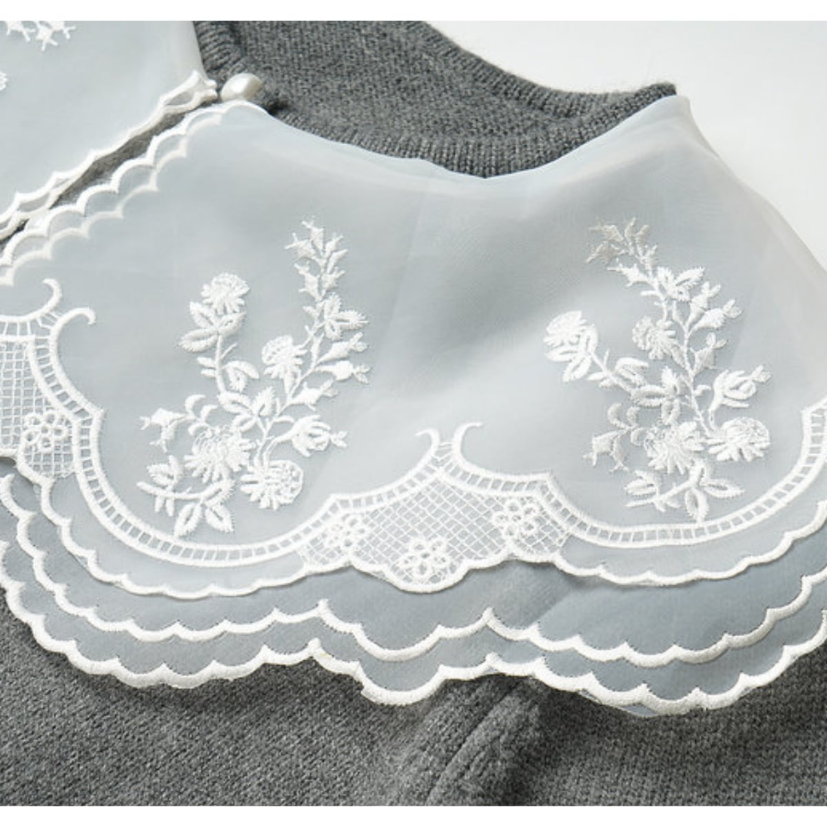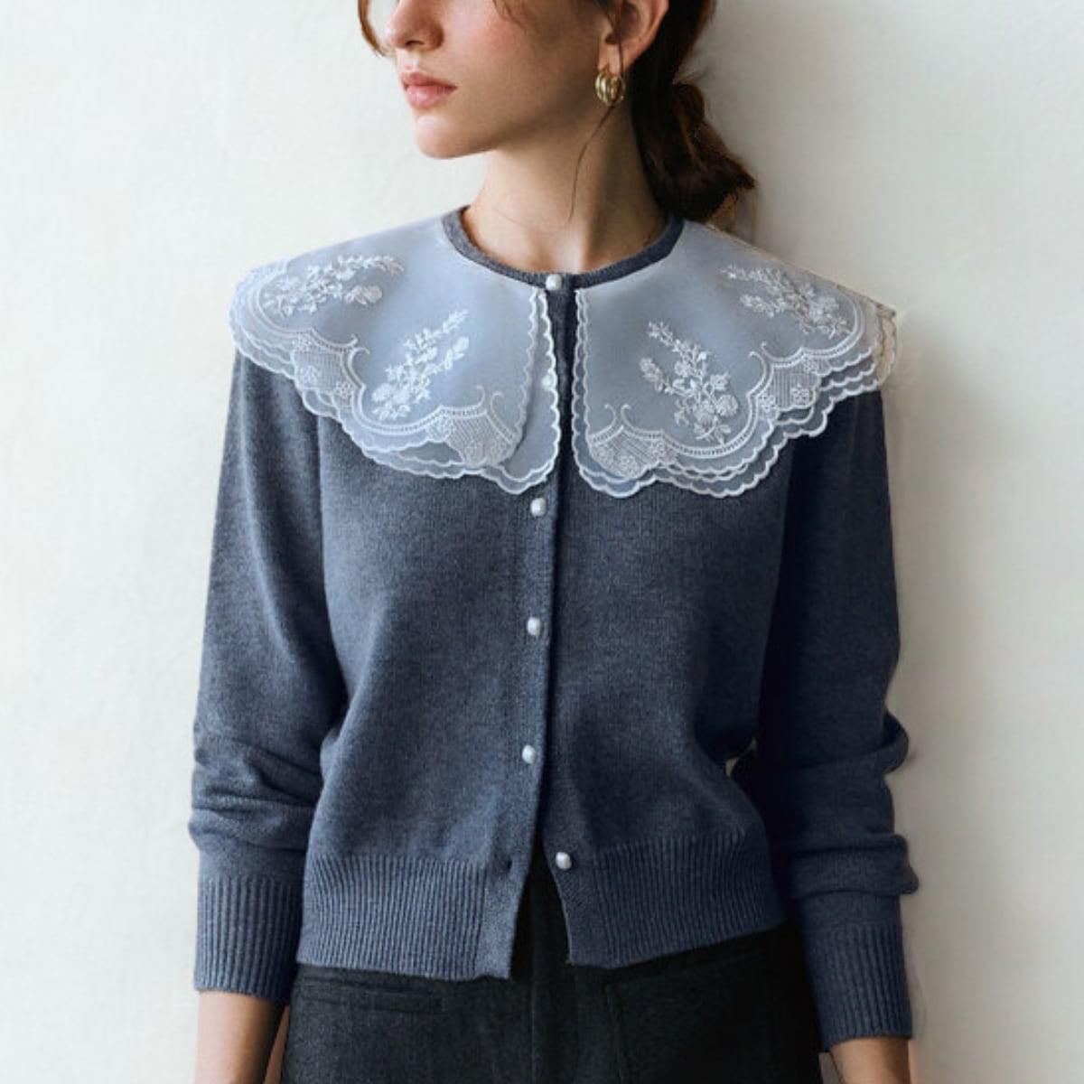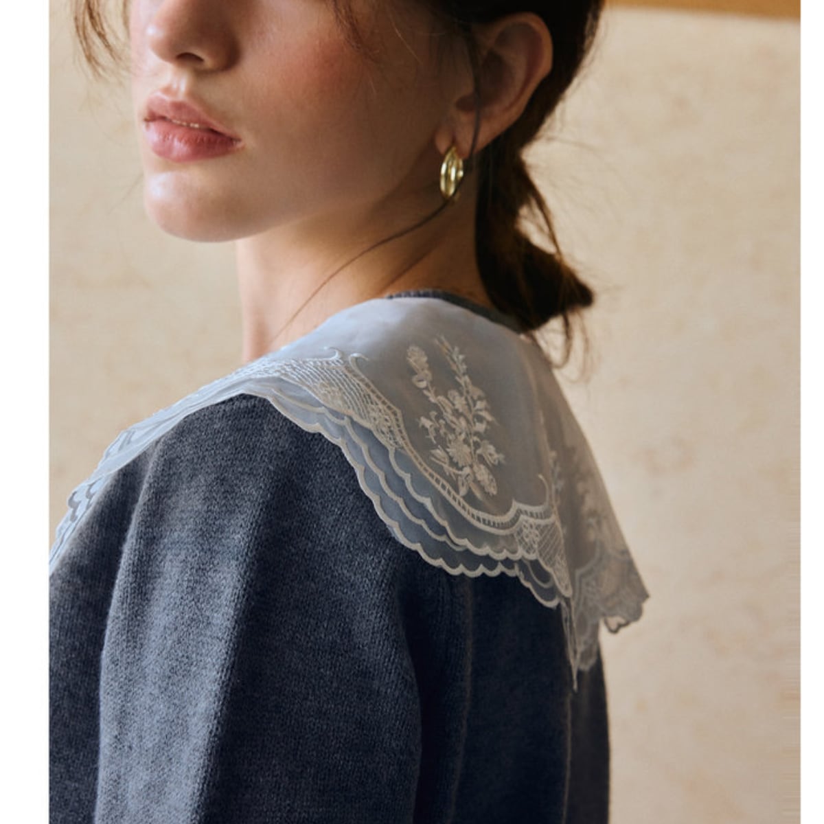 透け感のある大ぶりな襟が、重くなりがちな冬の装いに軽やかな抜け感をプラスします。