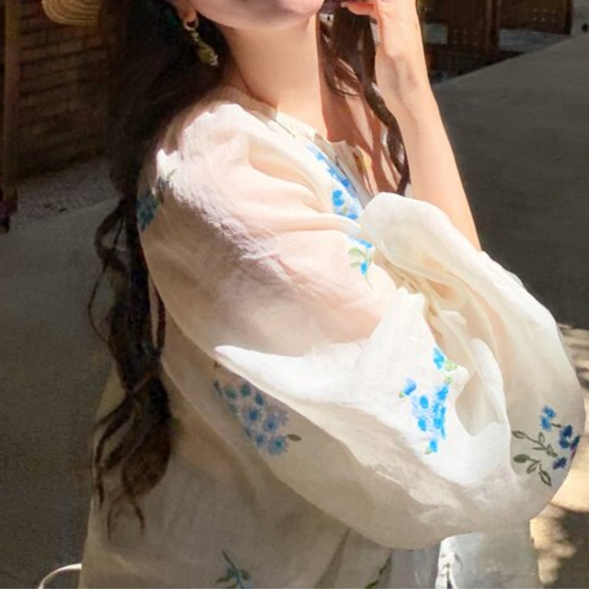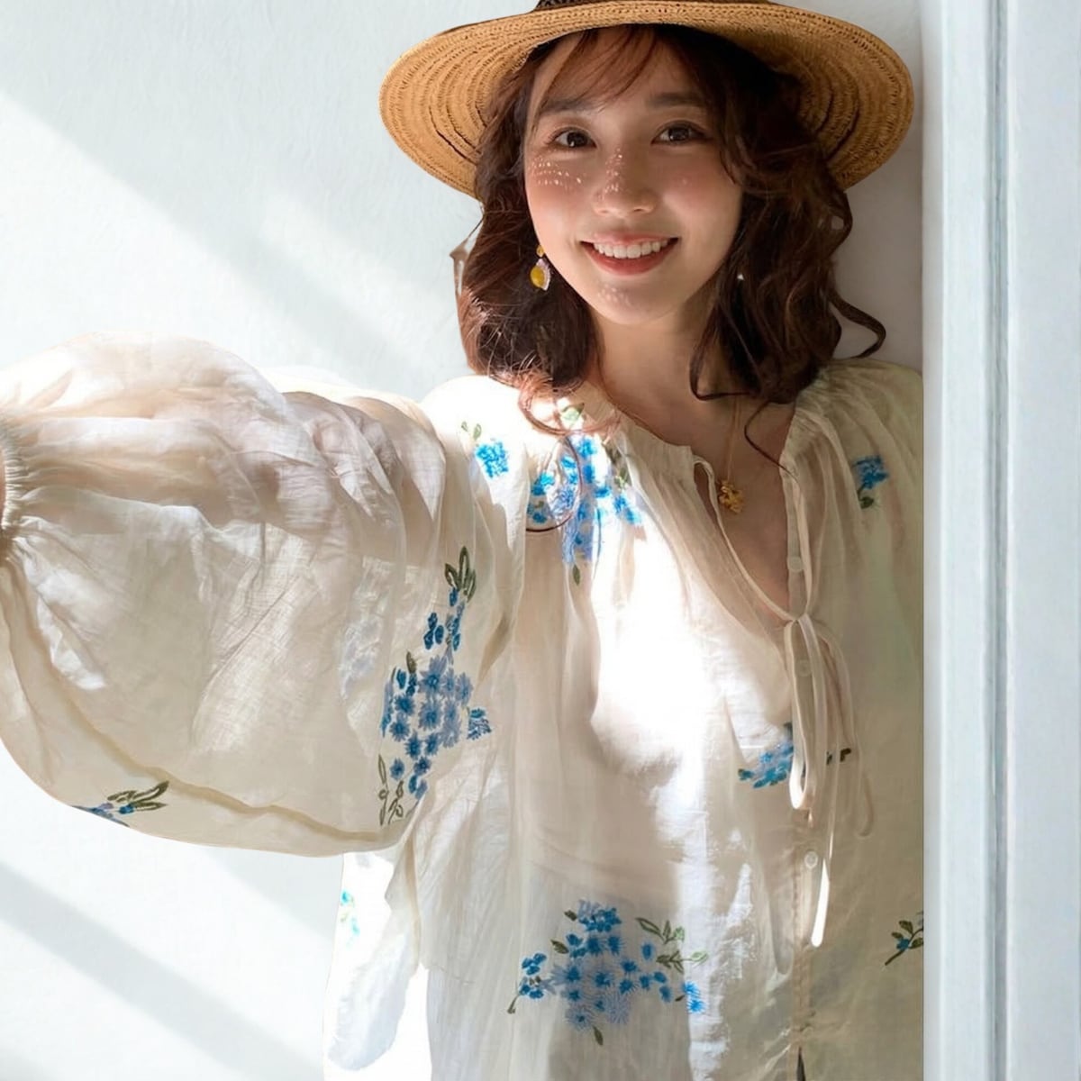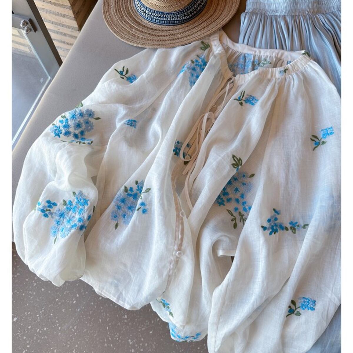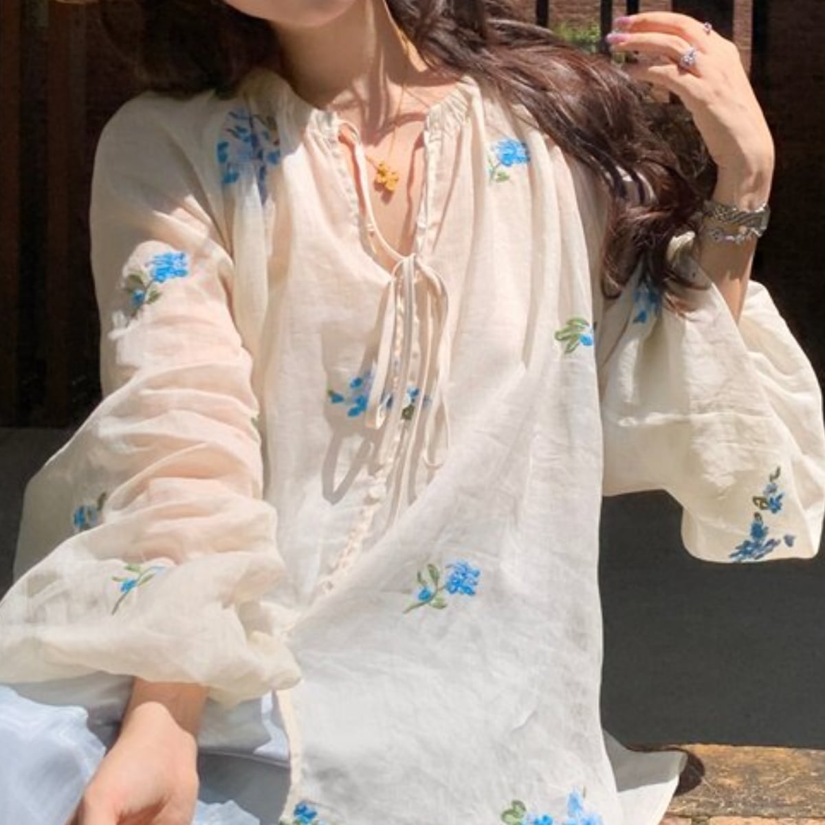 お顔周りをパッと明るく彩る、繊細な手仕事風のブルー刺繍が美しいブラウス。