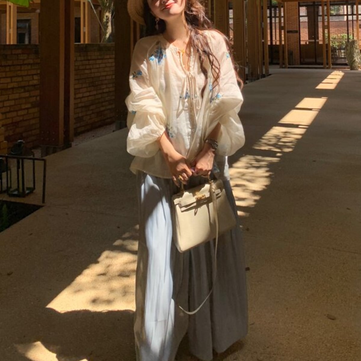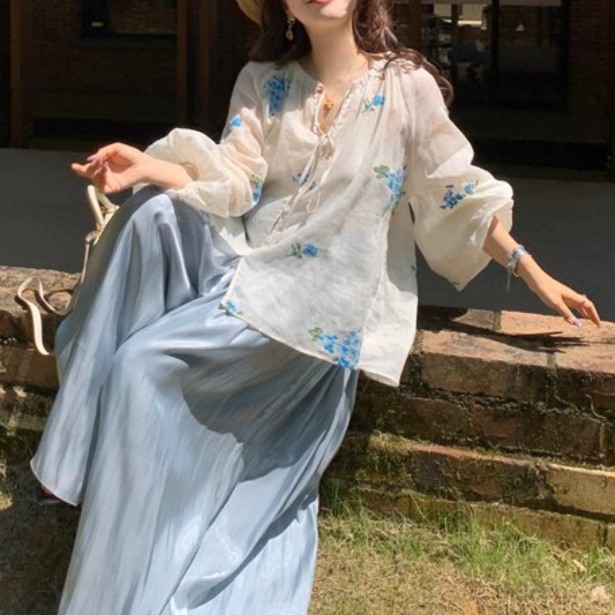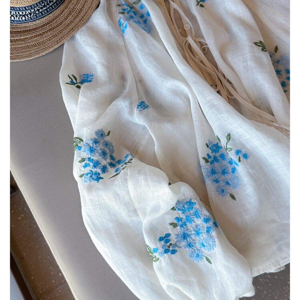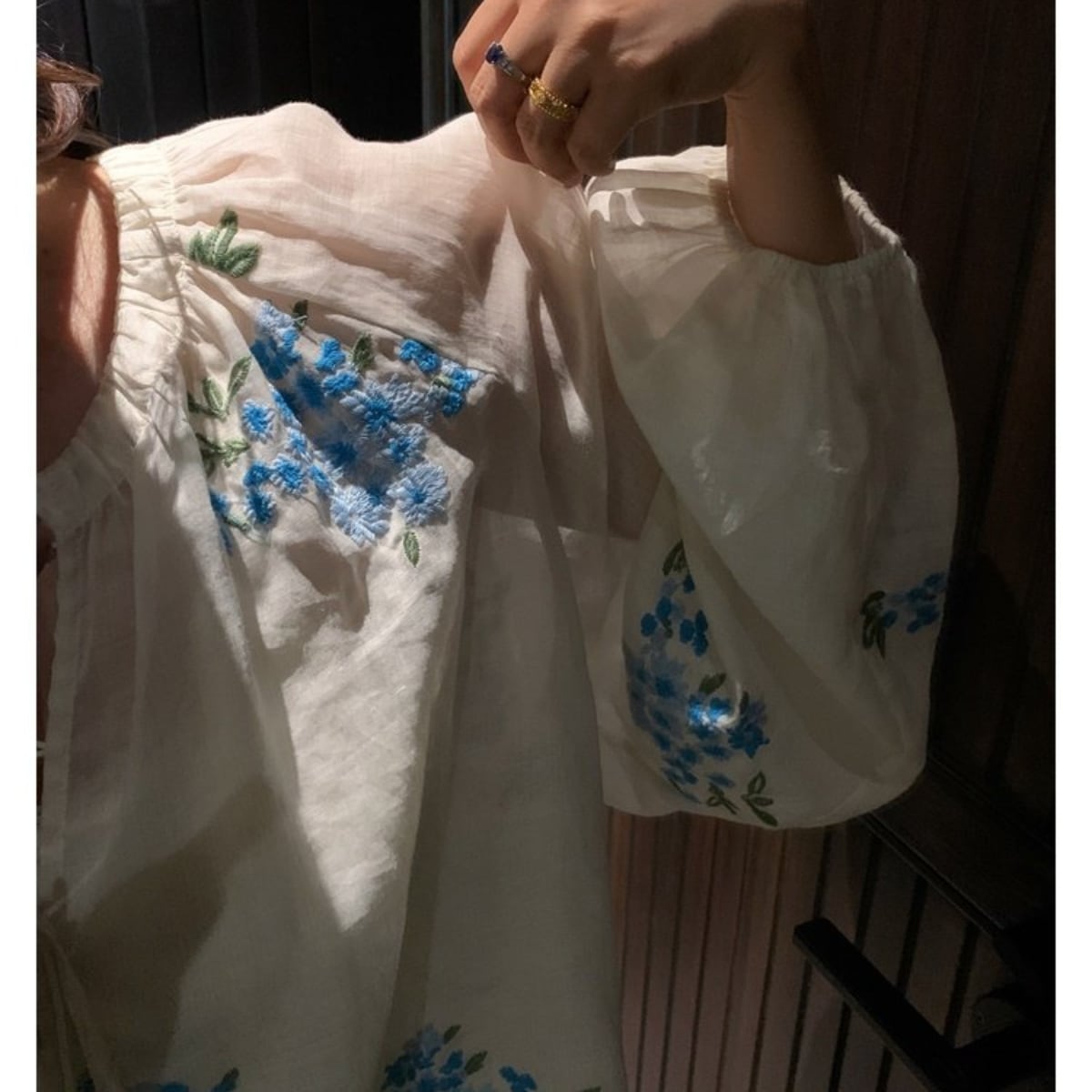 お顔周りをパッと明るく彩る、繊細な手仕事風のブルー刺繍が美しいブラウス。