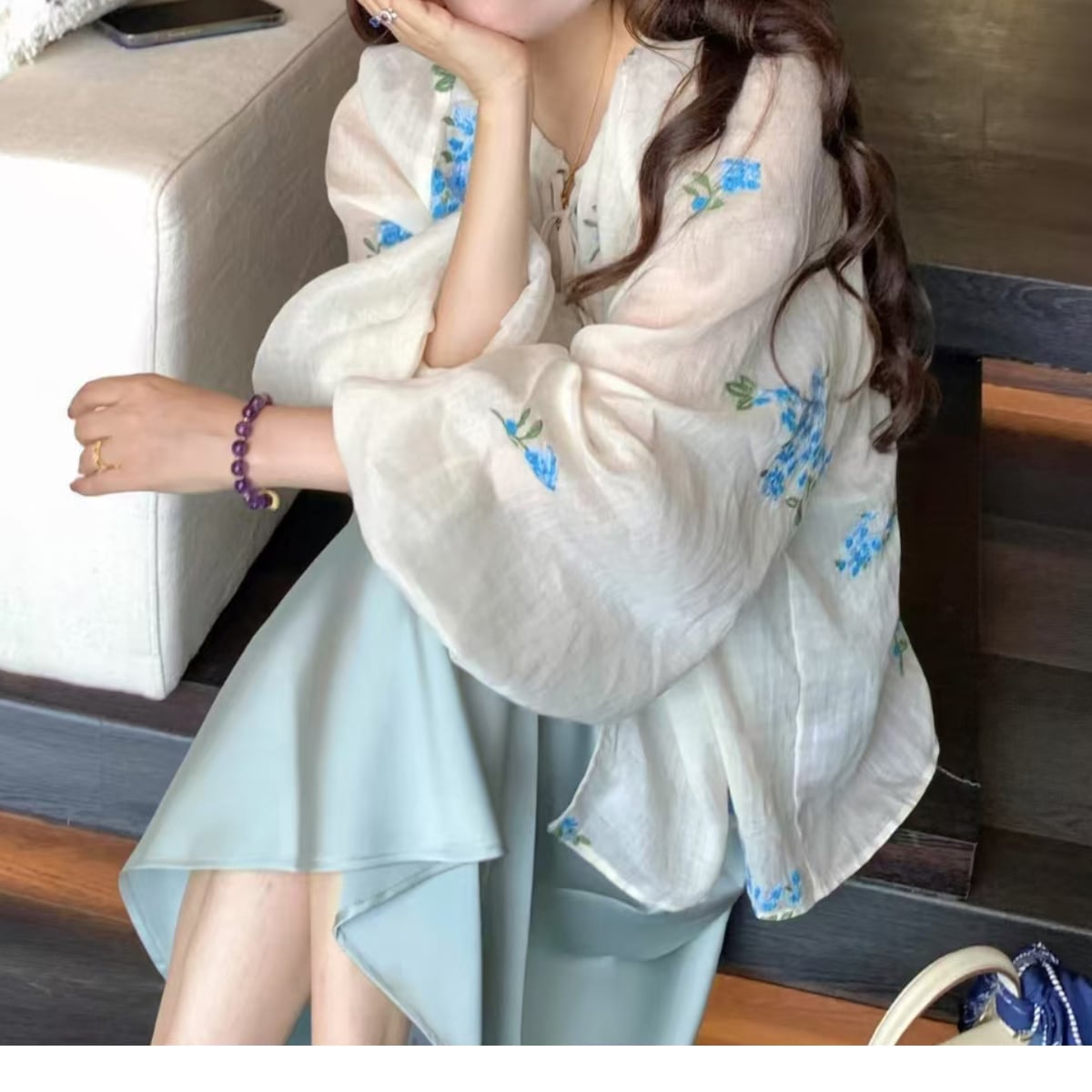ブルーフローラル刺繍 シアーギャザーブラウス ch0561