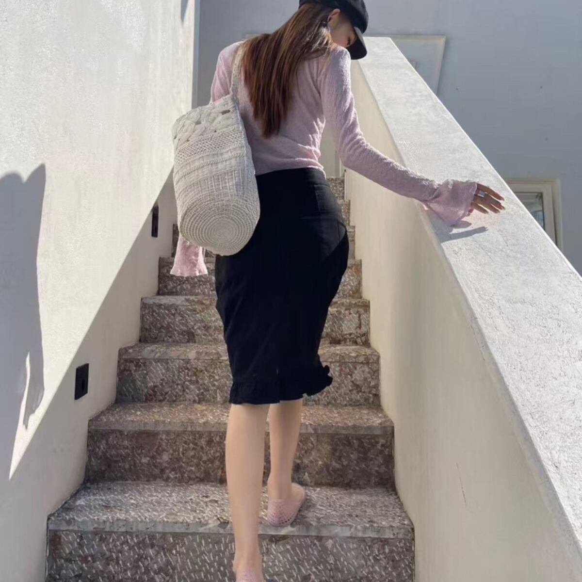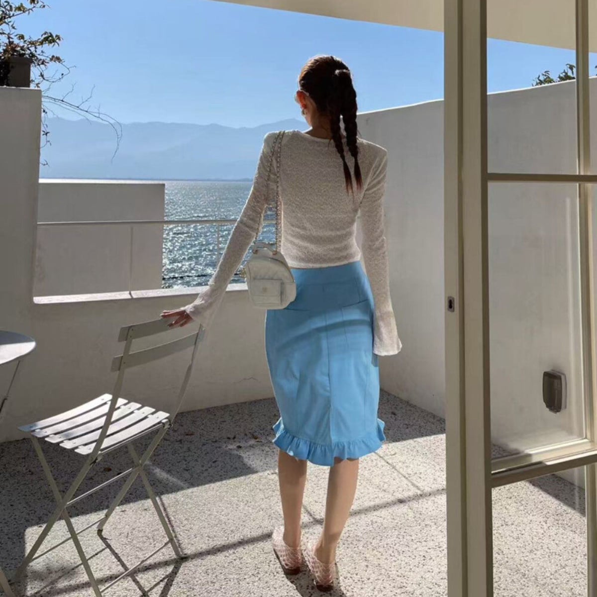 タイトなシルエットから裾にかけて広がる控えめなフリルが、歩くたびに軽やかなニュアンスをプラスします。