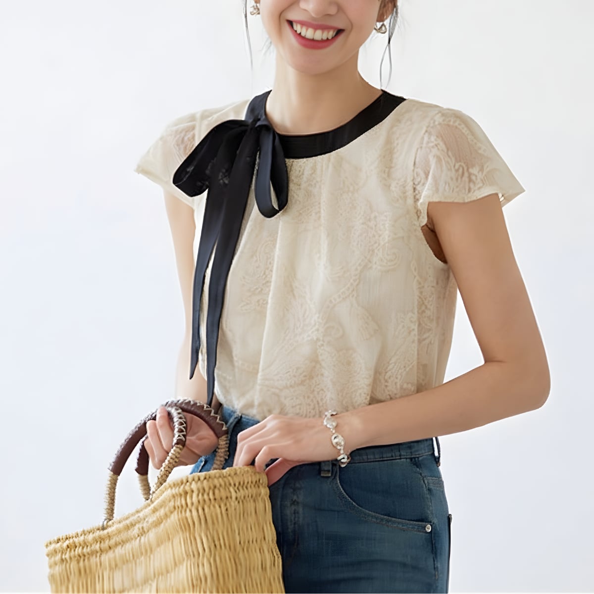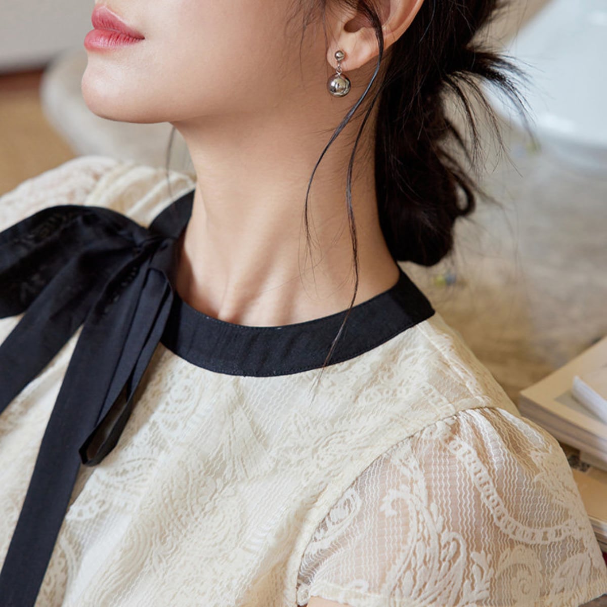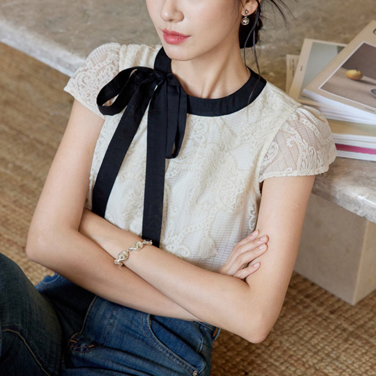 ヴィンテージライクなレース使いに、配色リボンのアクセントが今っぽいフレンチガーリーなブラウスが登場。透け感のあるシアーなレース素材が、重たくなりすぎず軽やかな印象を与えます。