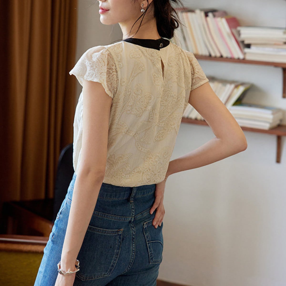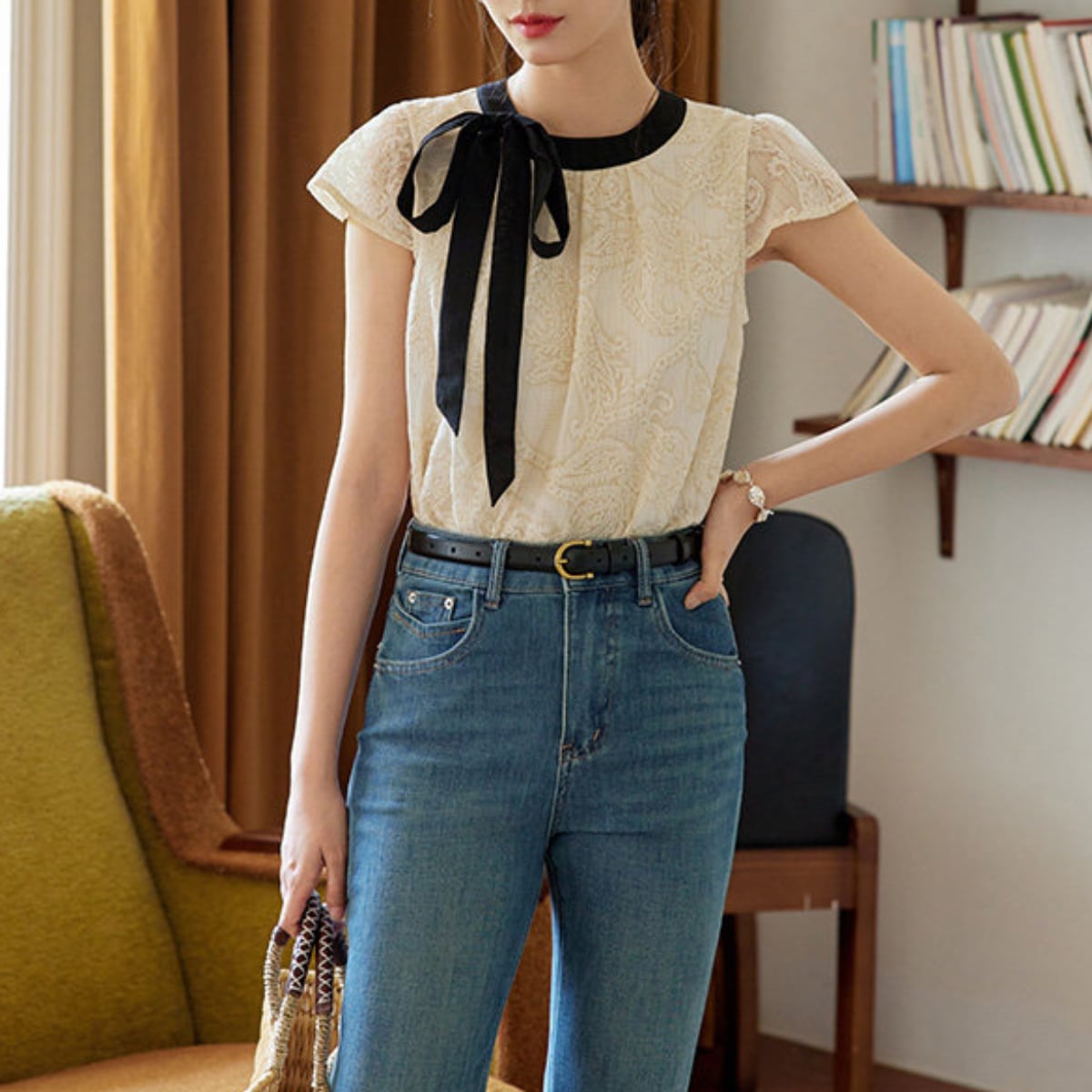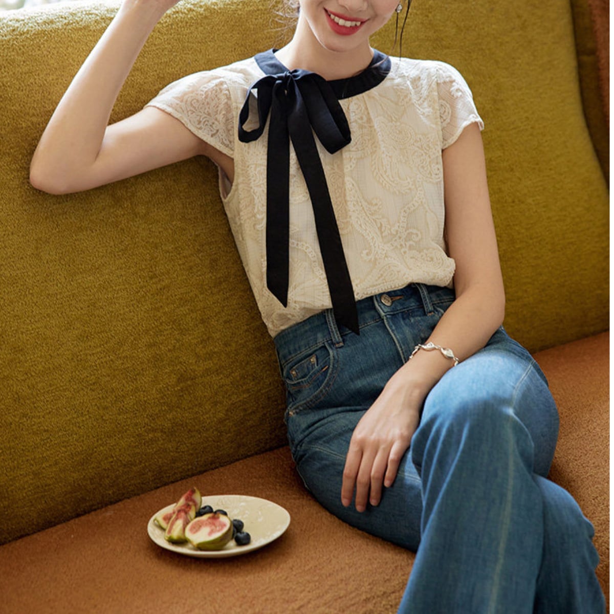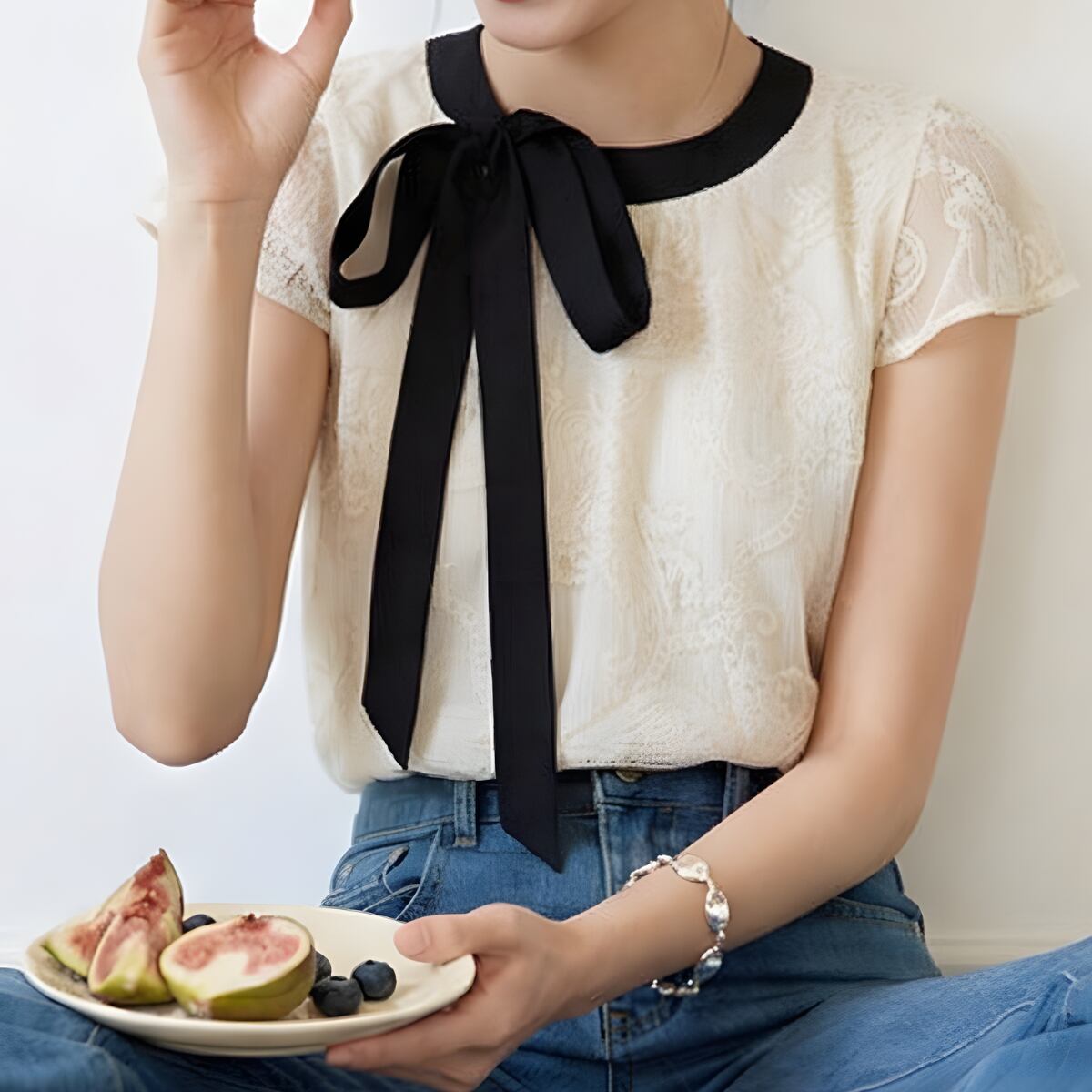 ヴィンテージライクなレース使いに、配色リボンのアクセントが今っぽいフレンチガーリーなブラウスが登場。透け感のあるシアーなレース素材が、重たくなりすぎず軽やかな印象を与えます。