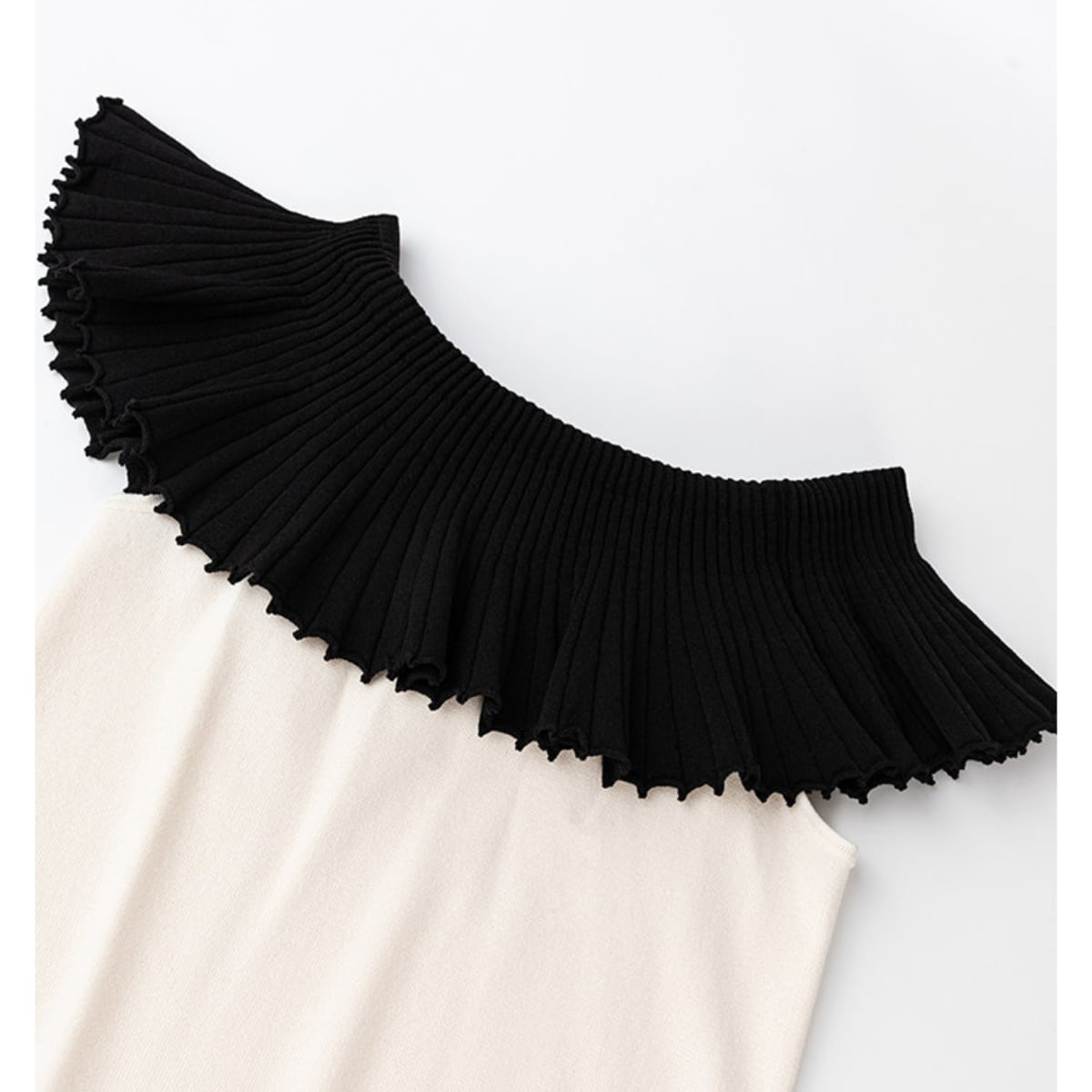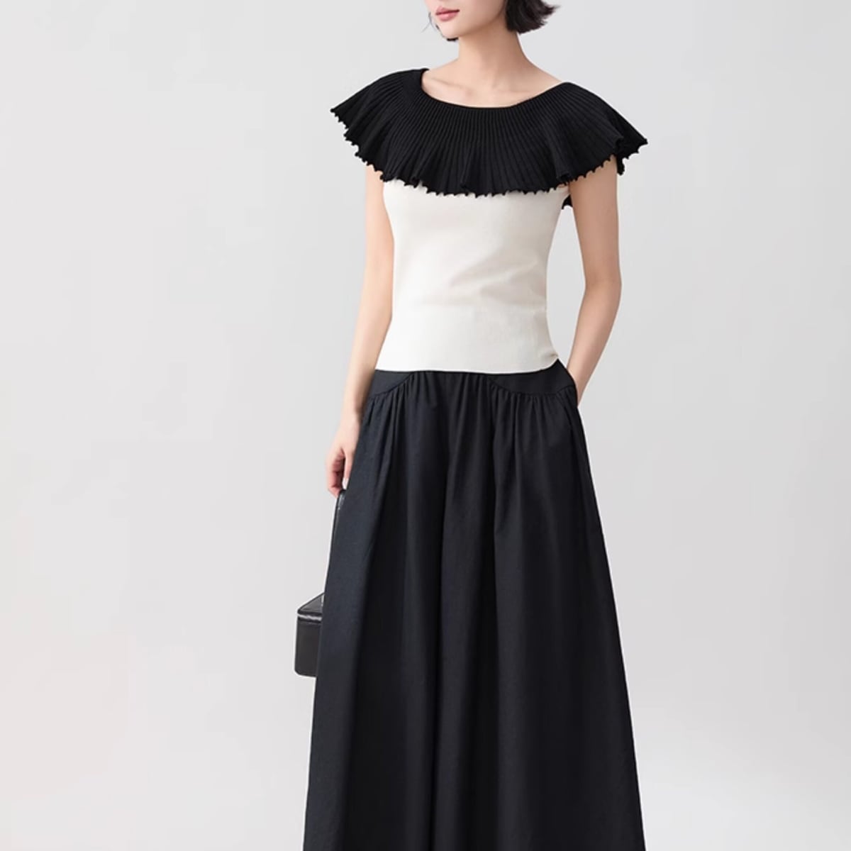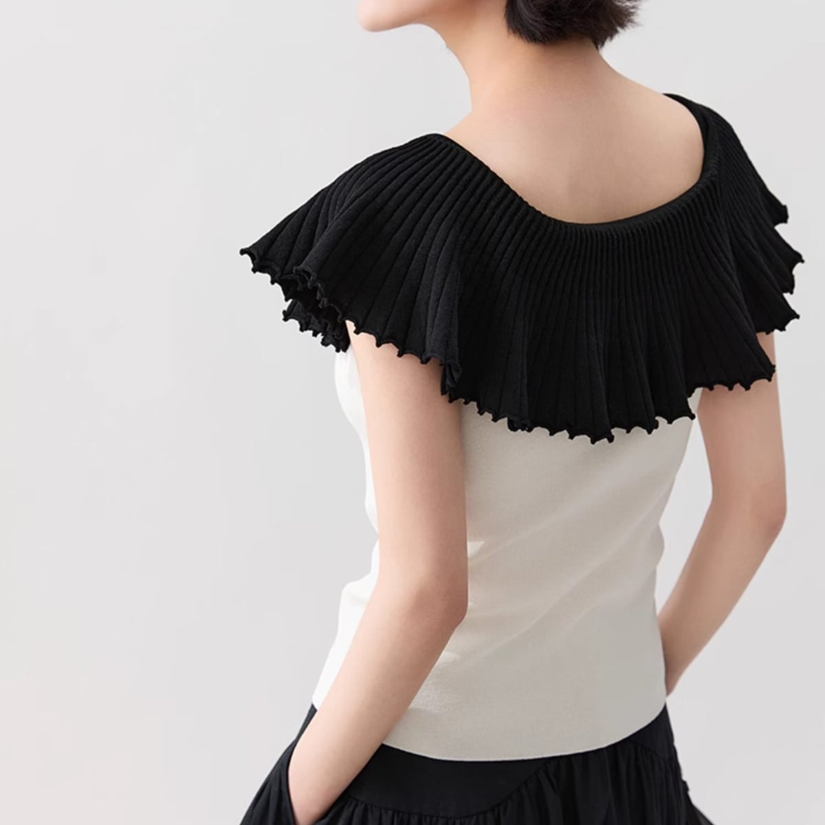黒いプリーツ襟がケープのように肩を覆い、シンプルになりがちな夏のスタイルを一気に格上げしてくれます。ヘルシーな肌見せができるデザインで、デコルテを美しく見せてくれるのも嬉しいポイント。