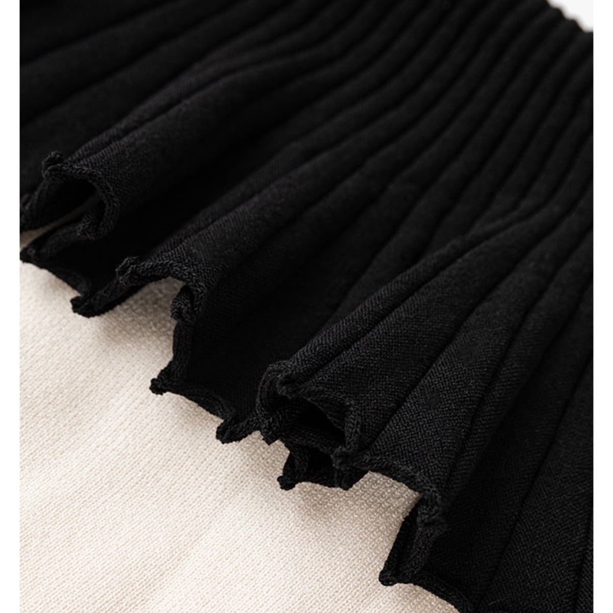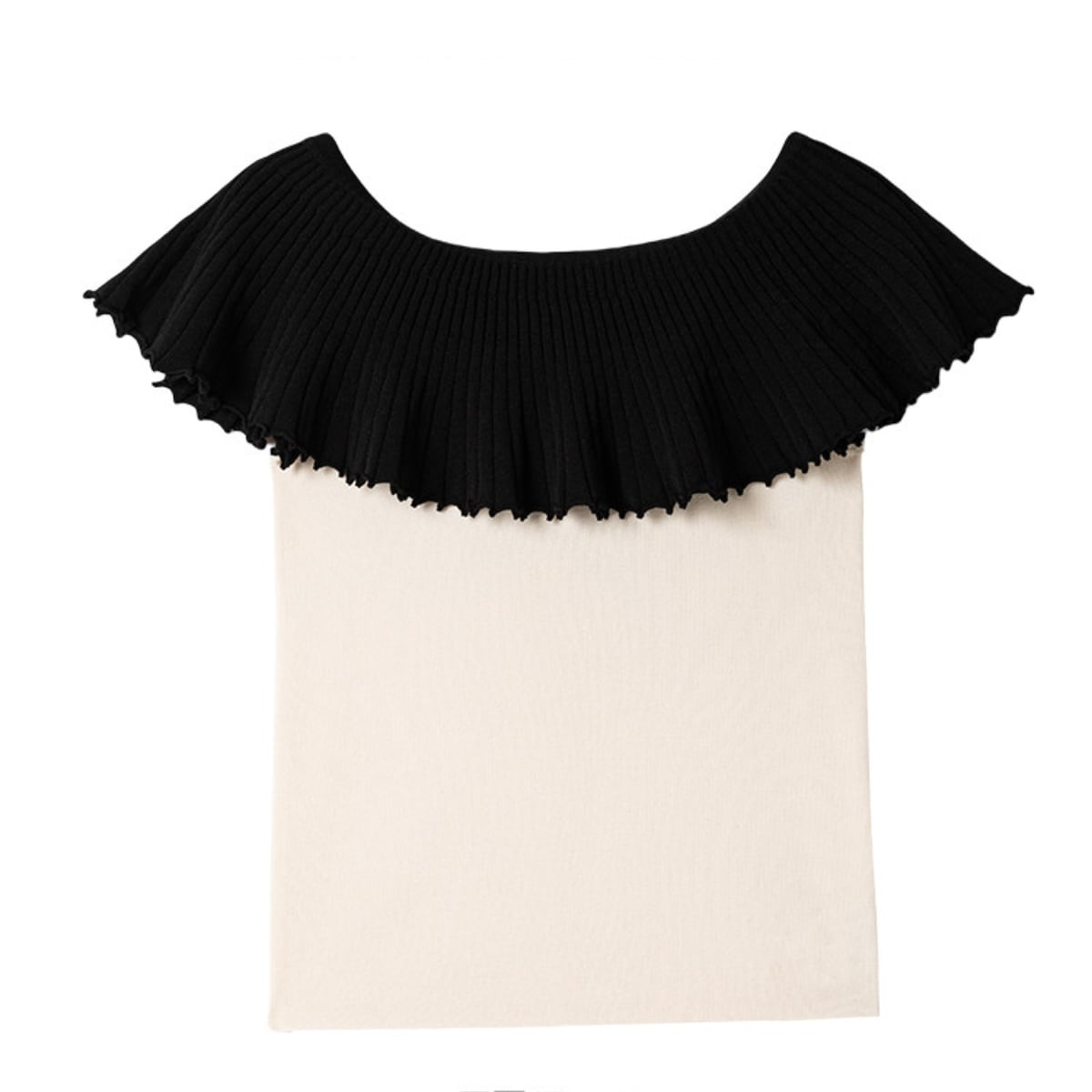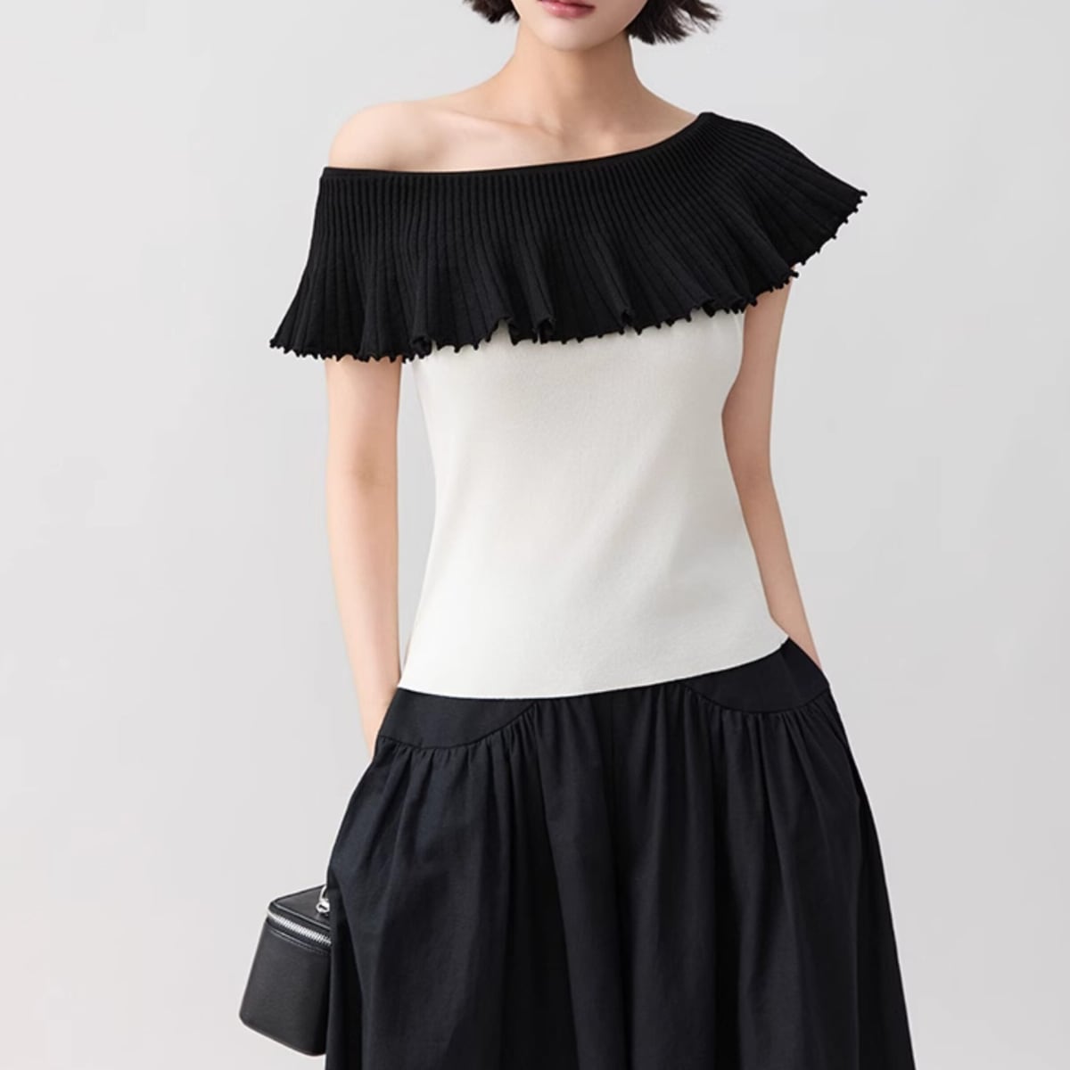 黒いプリーツ襟がケープのように肩を覆い、シンプルになりがちな夏のスタイルを一気に格上げしてくれます。ヘルシーな肌見せができるデザインで、デコルテを美しく見せてくれるのも嬉しいポイント。