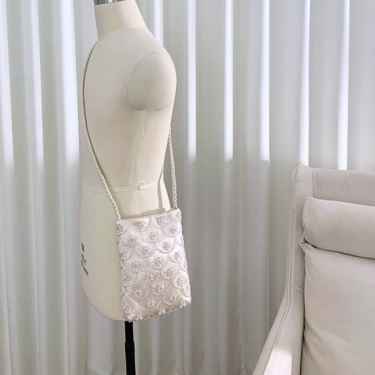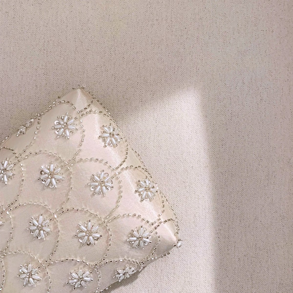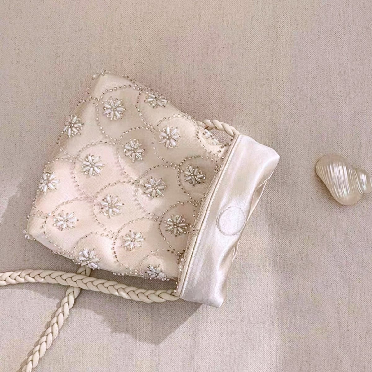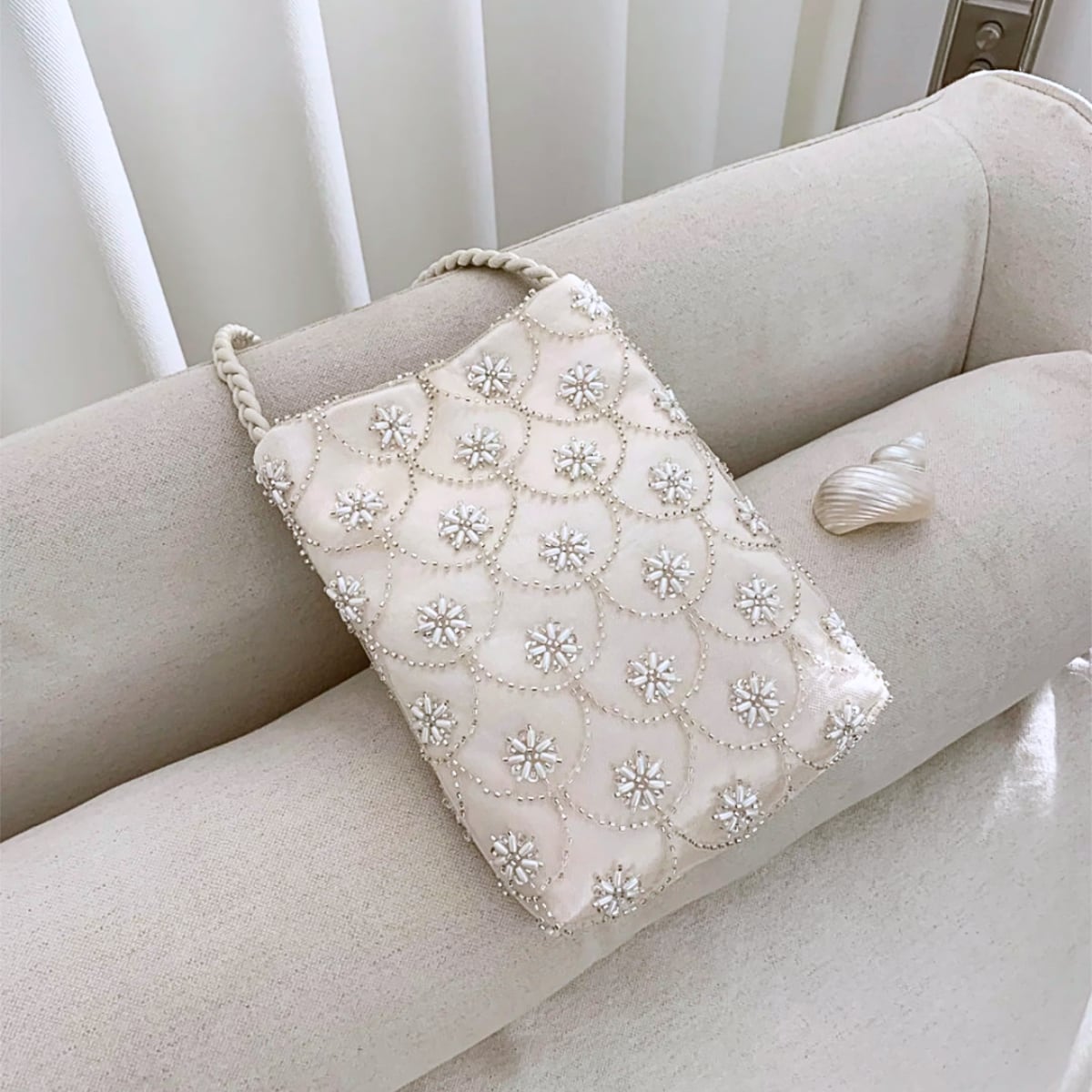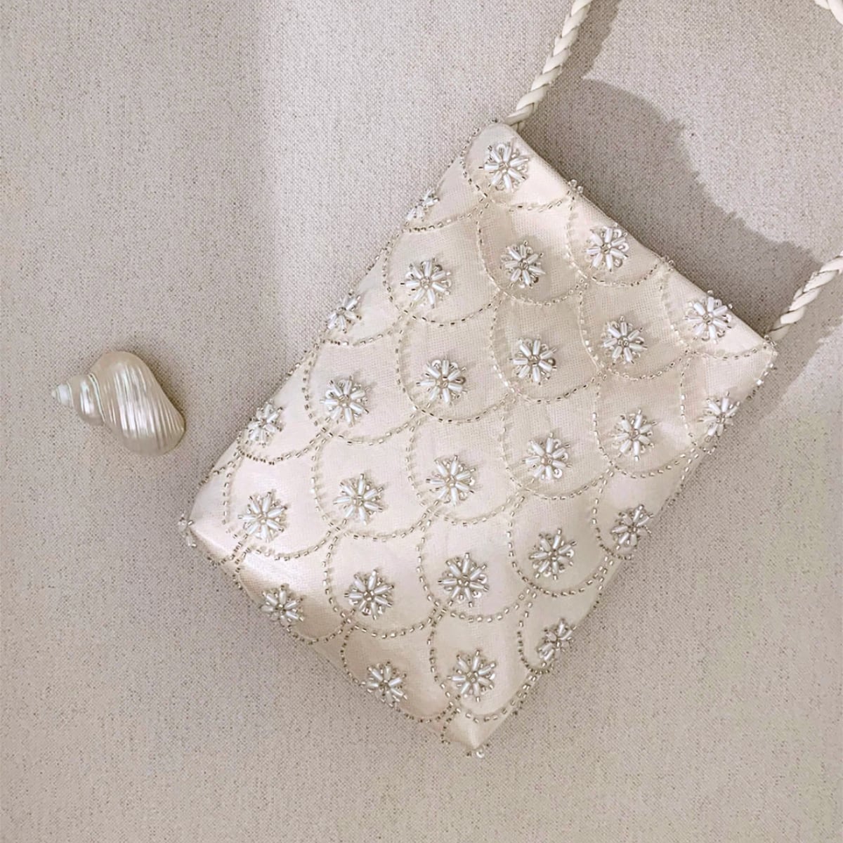 繊細なスカラップ刺繍に、雪の結晶のように煌めくビーズを贅沢にあしらった主役級バッグ。
