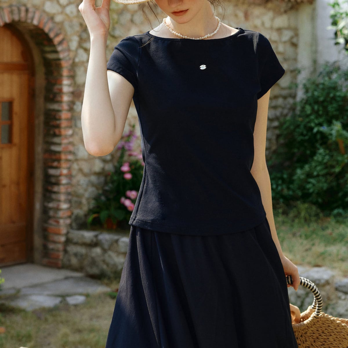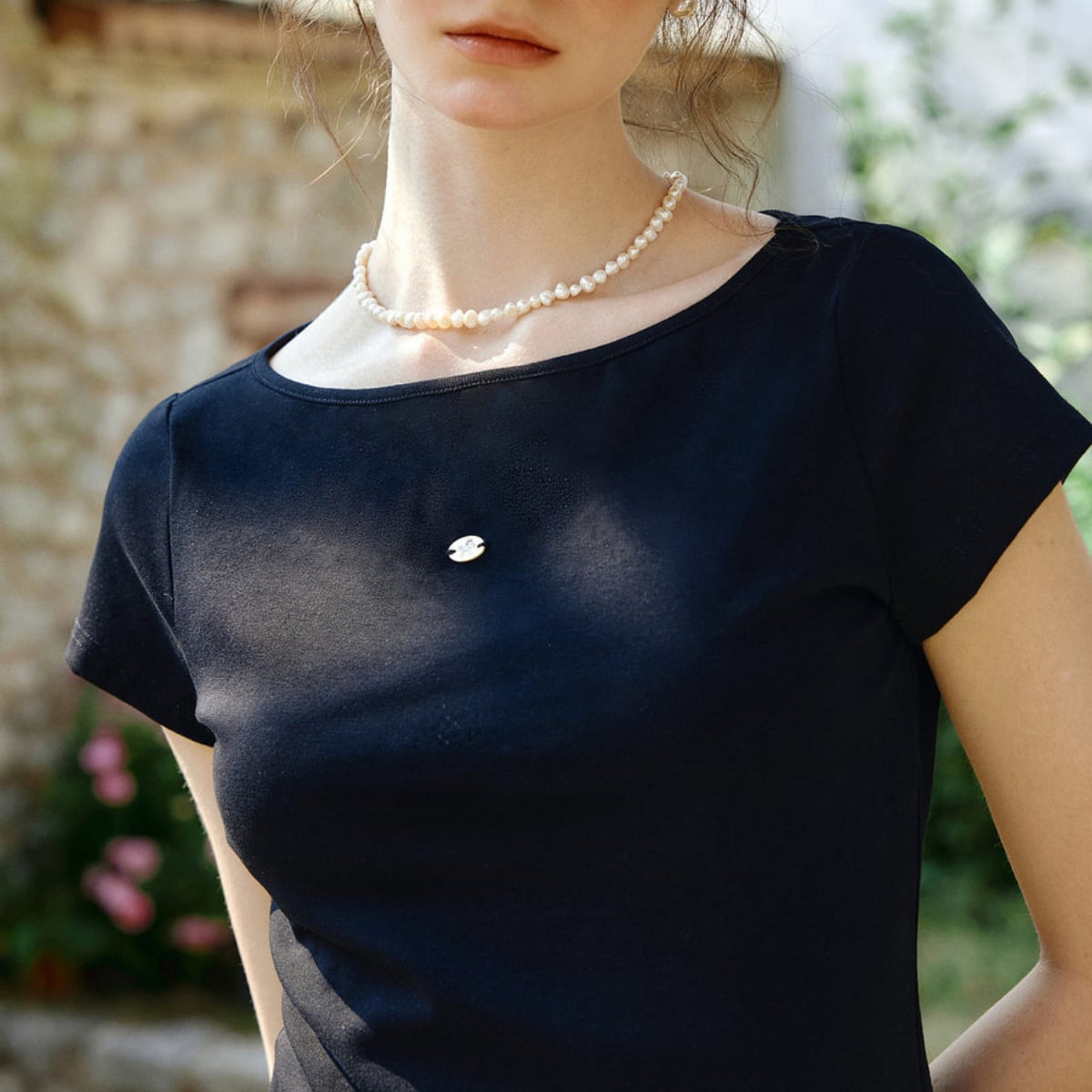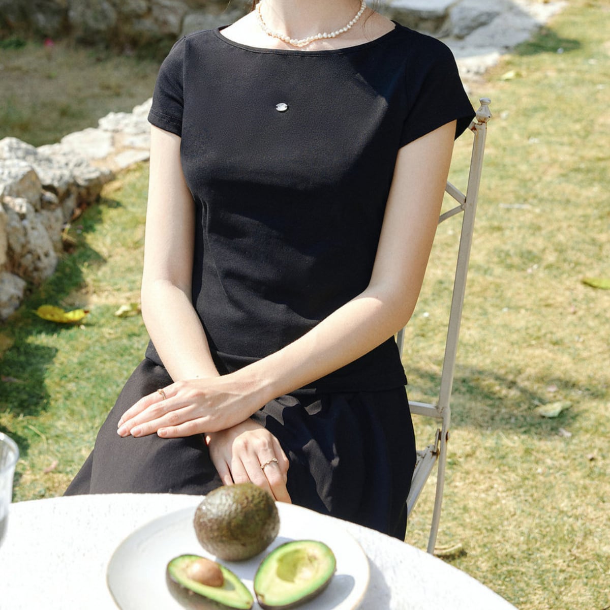 フロントは鎖骨を品よく美しく見せるボートネック。一見すると究極にシンプルな黒のカットソーですが、一歩歩き出し、振り返った瞬間にハッとさせる。そんな「バックシャン」な魅力が詰まった一枚が届きました。