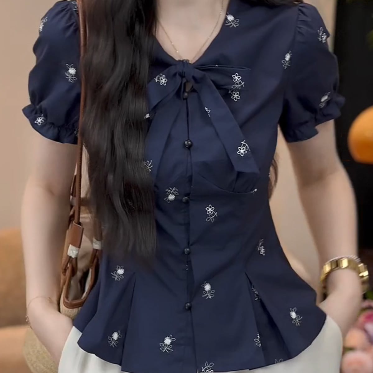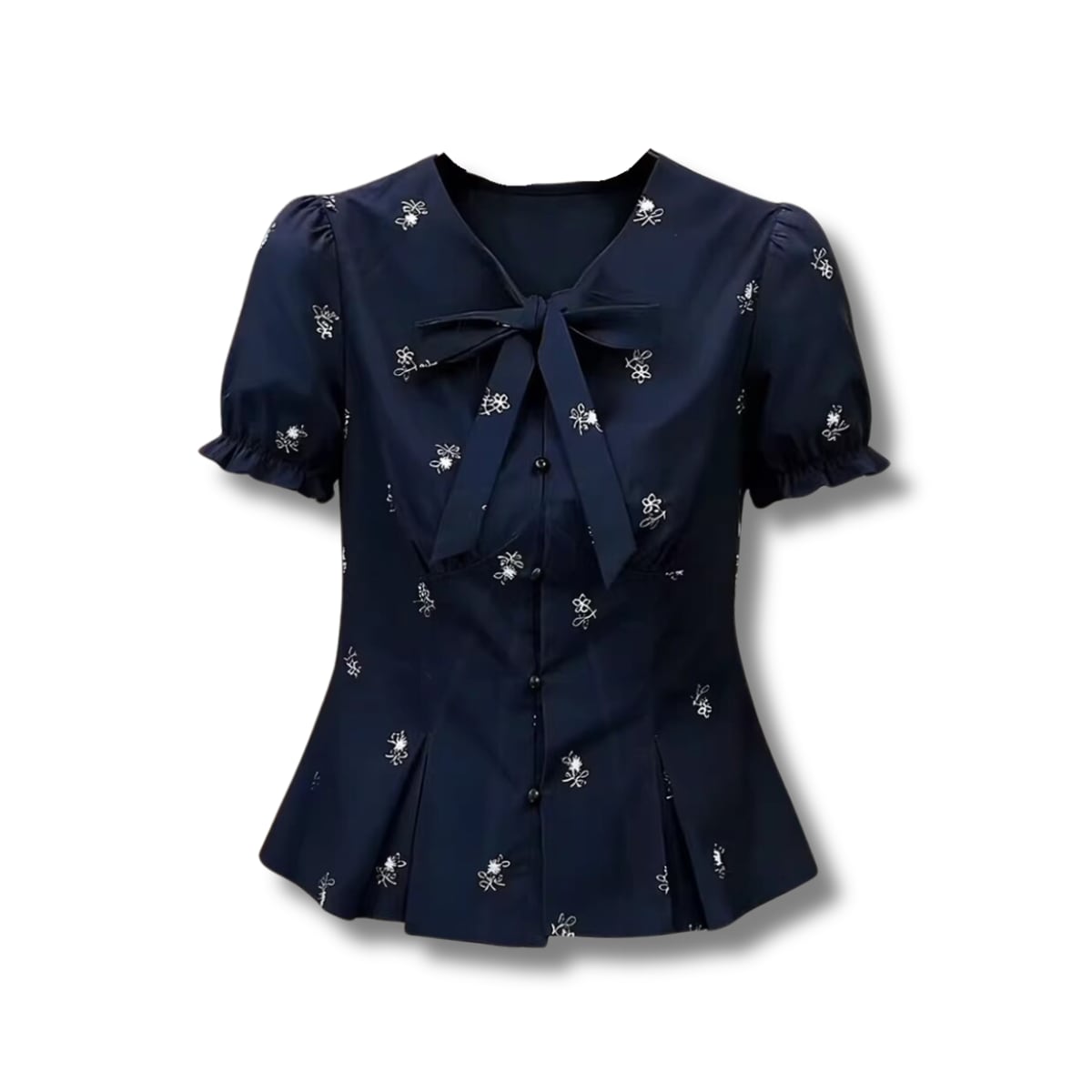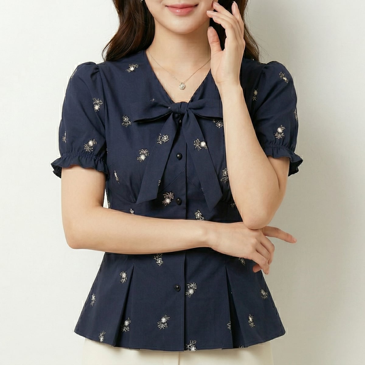 可憐な小花柄刺繍と大きなリボンが目を引く、韓国アイドルのような華やかさを纏えるネイビーブラウスです。