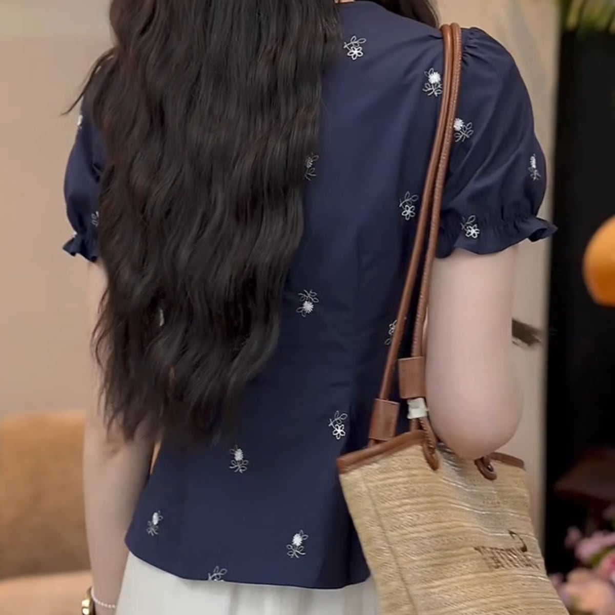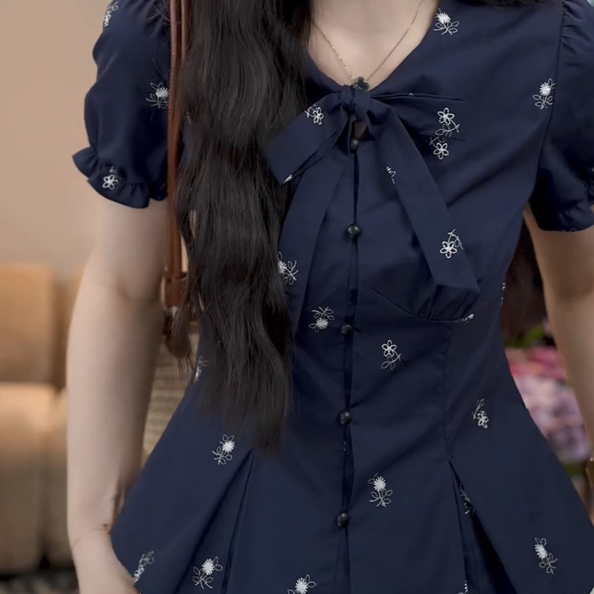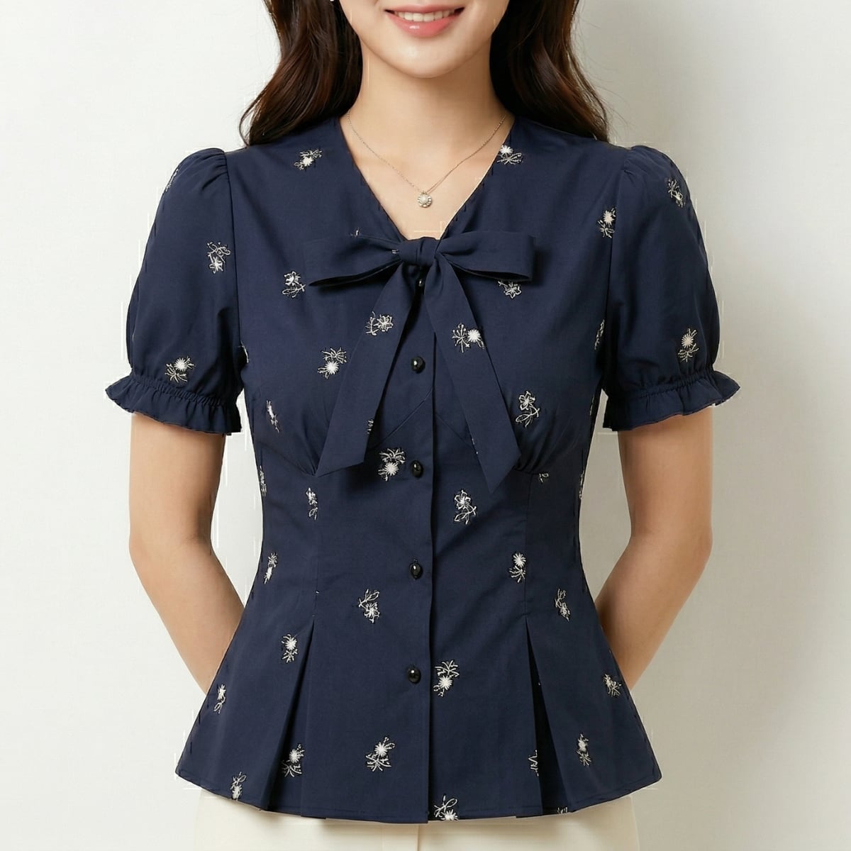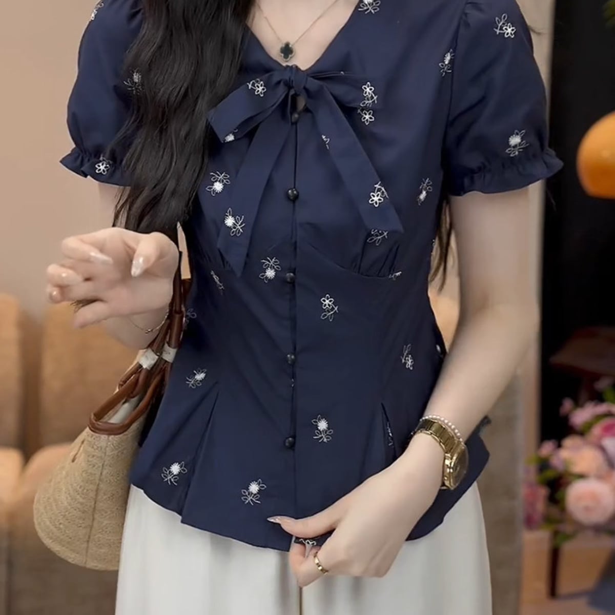 可憐な小花柄刺繍と大きなリボンが目を引く、韓国アイドルのような華やかさを纏えるネイビーブラウスです。