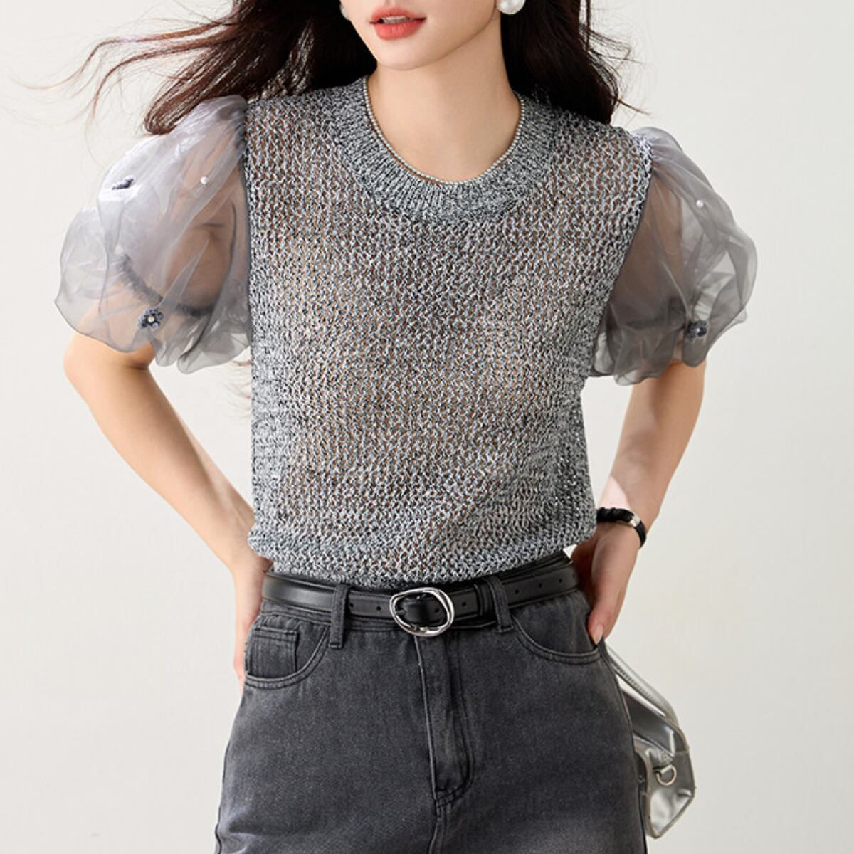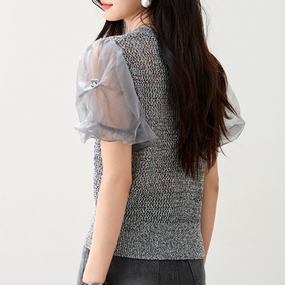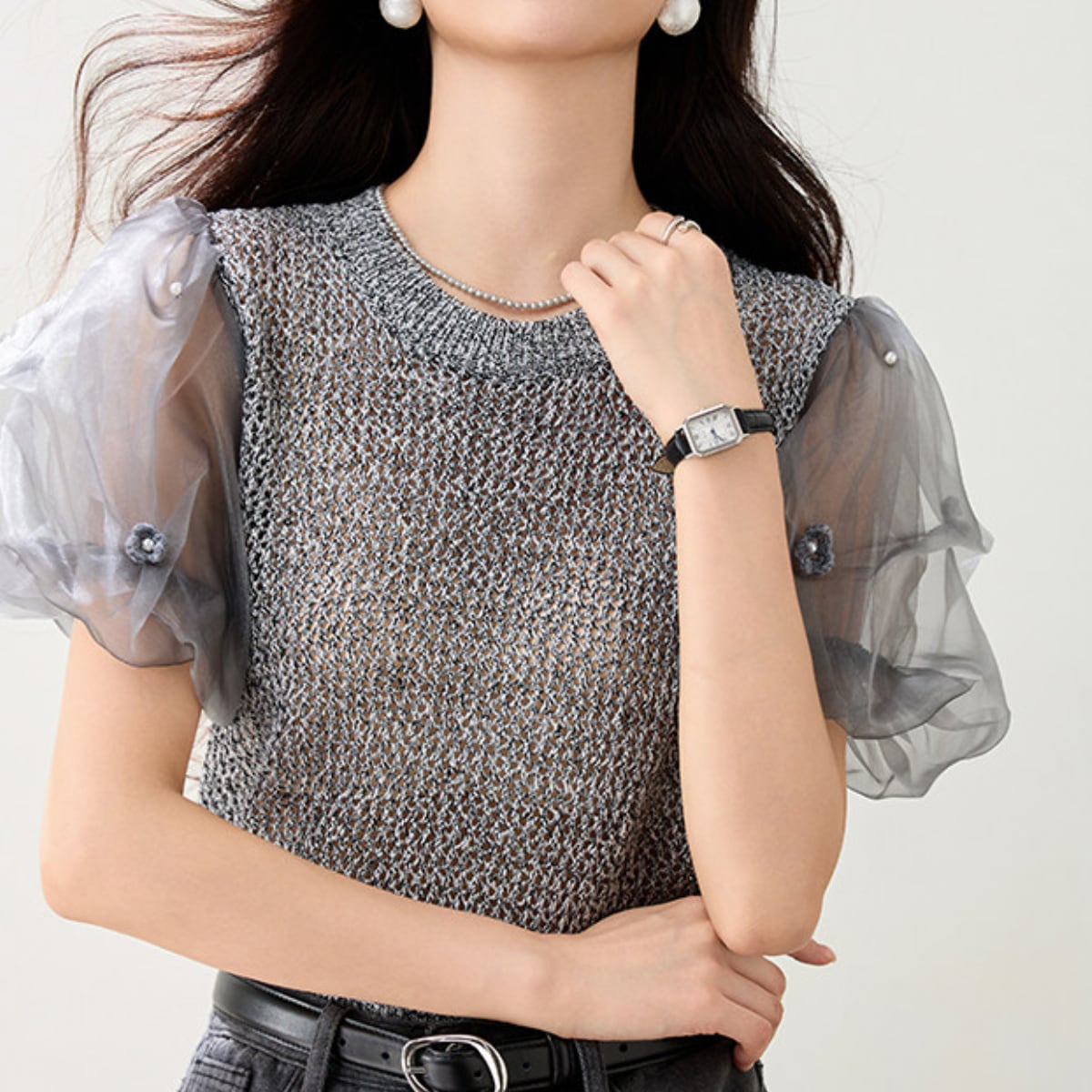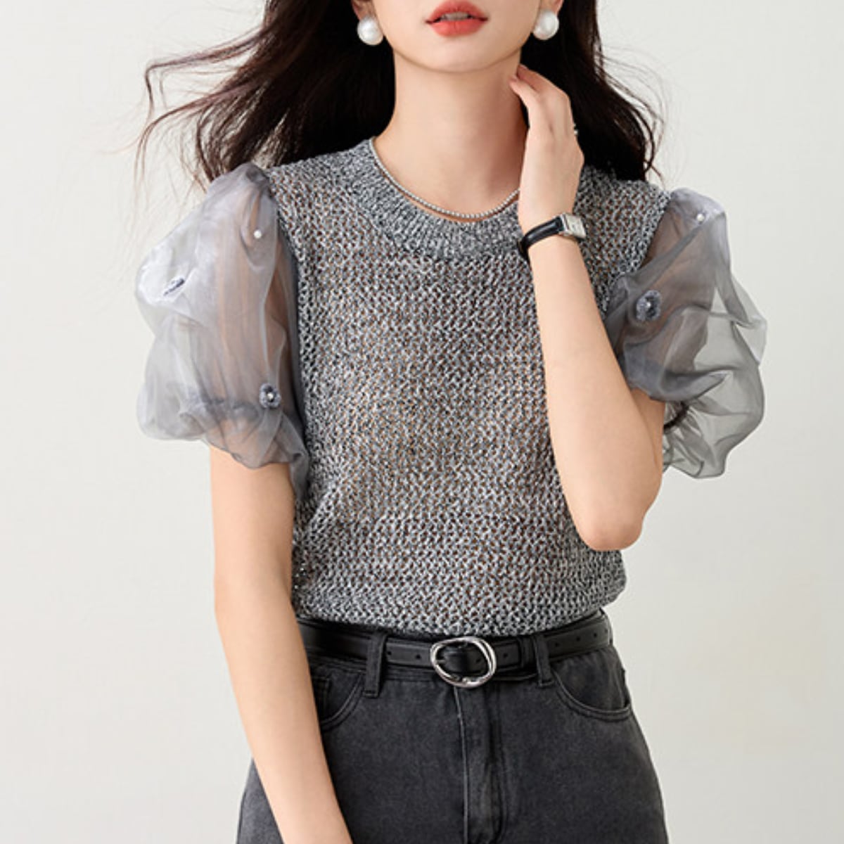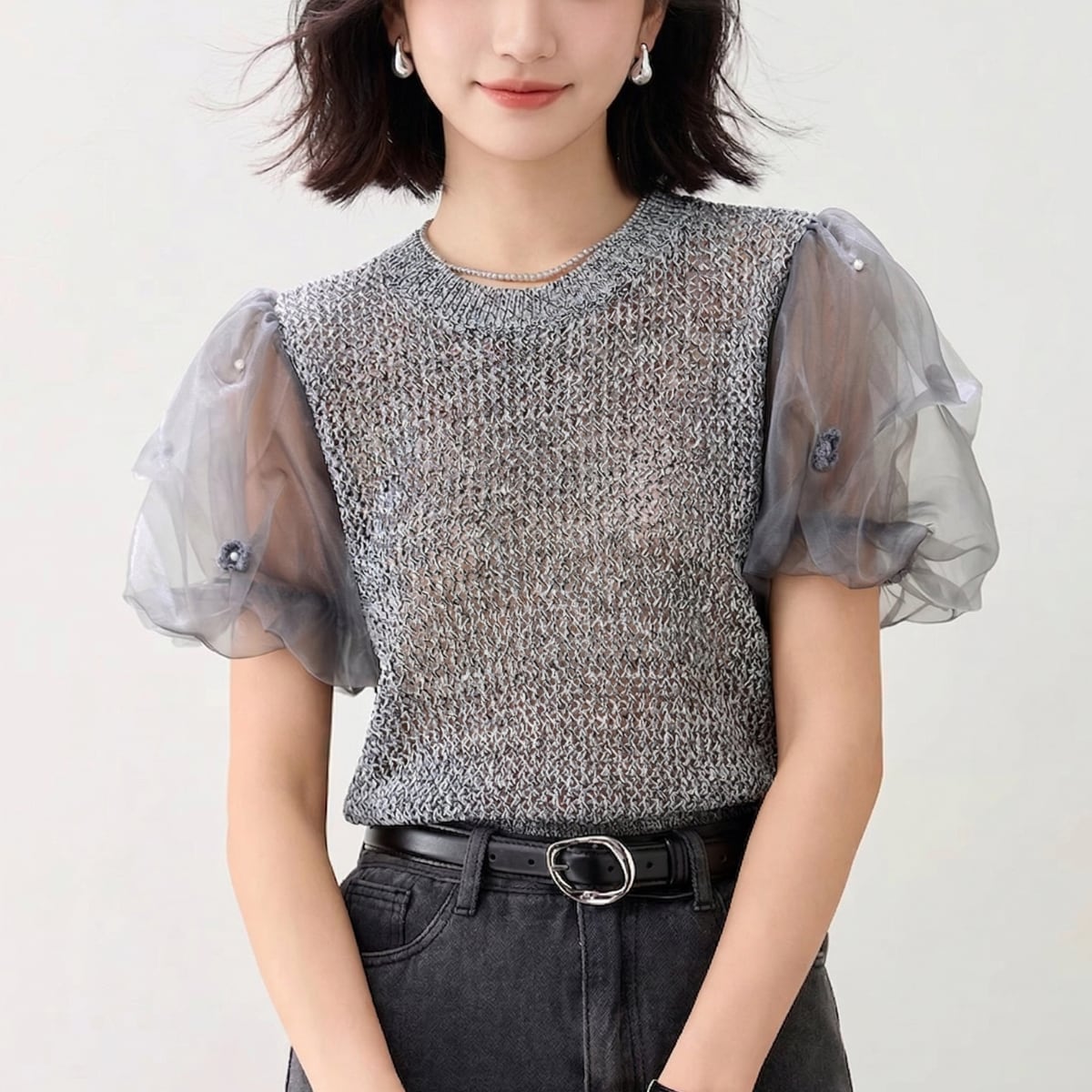 微かにきらめくラメ混のメランジニットに、繊細なシアー素材のボリューム袖を組み合わせた、主役級の華やかトップスです。