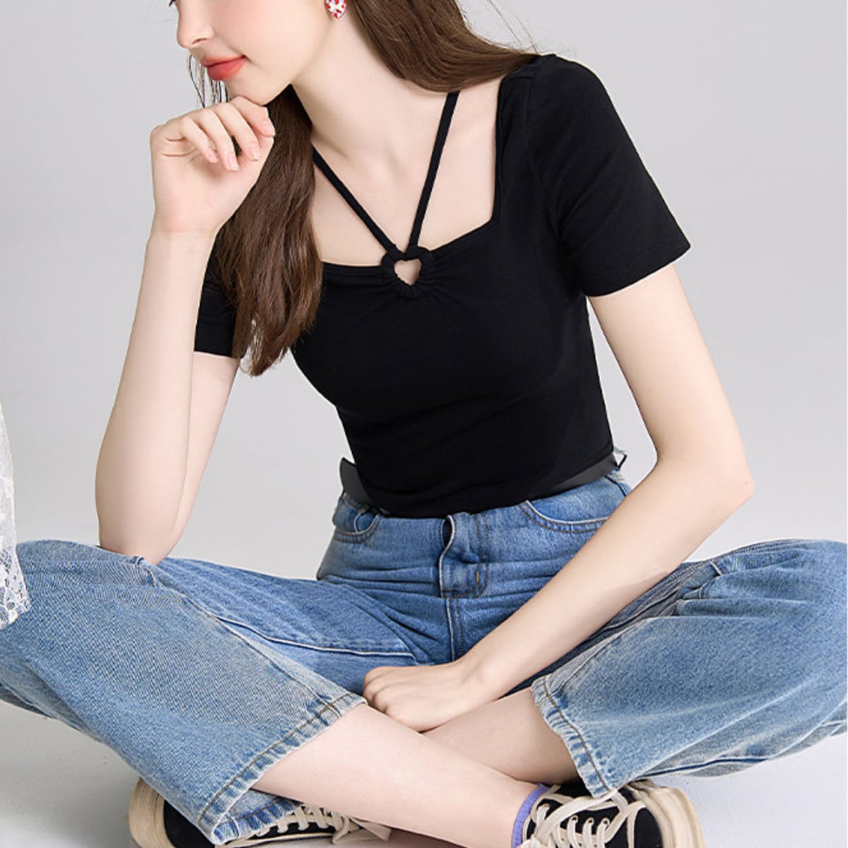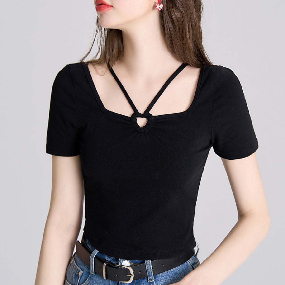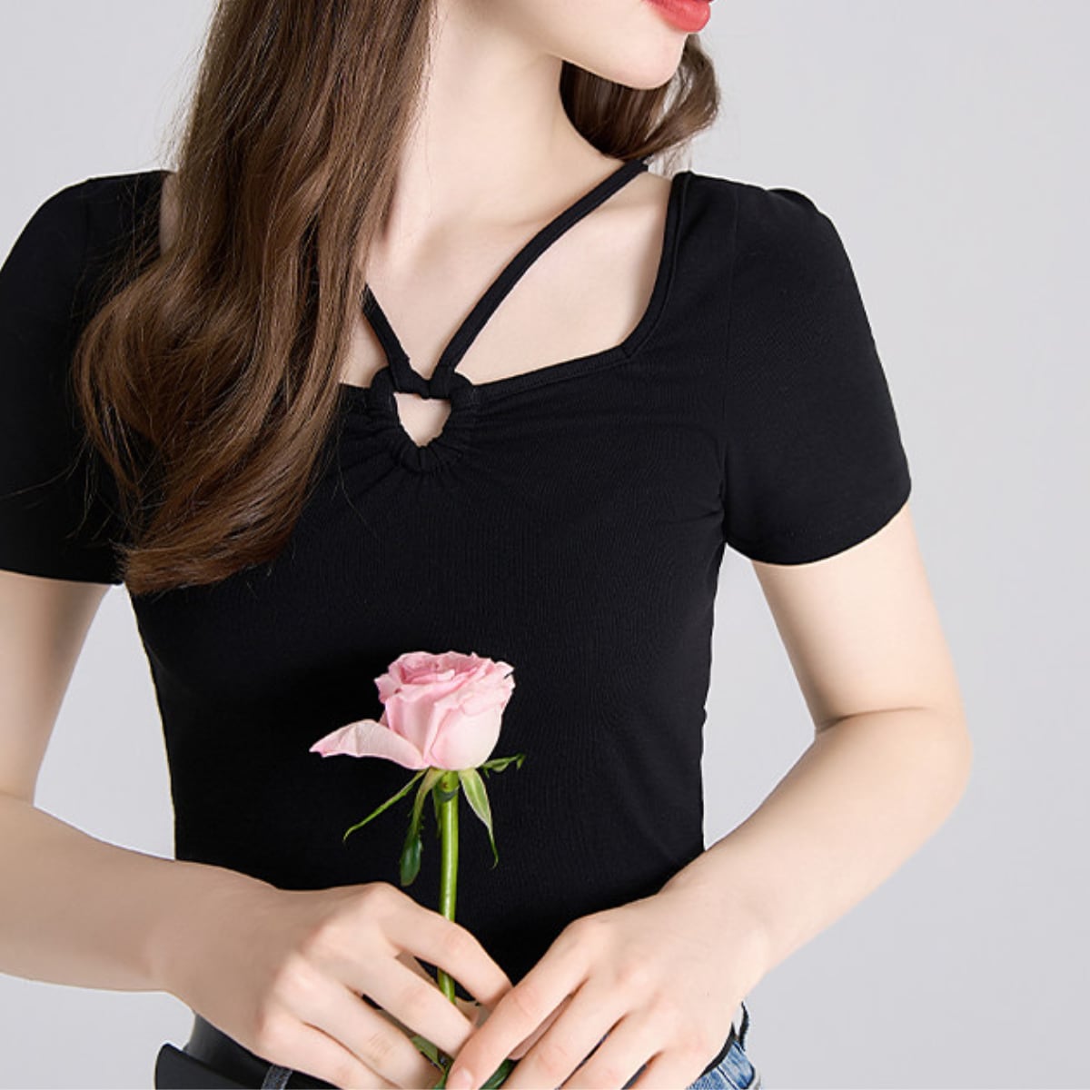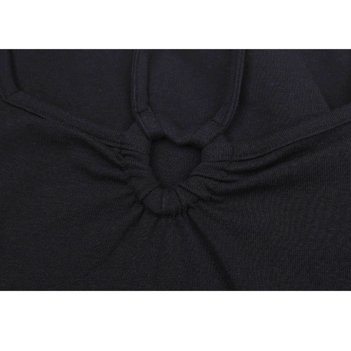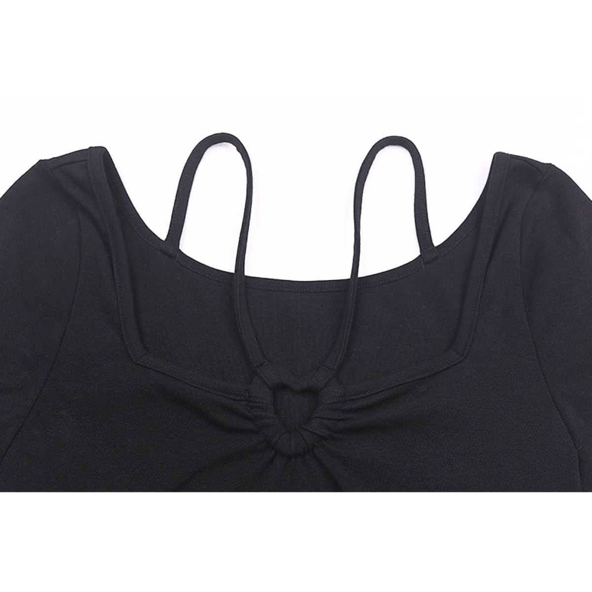 最大の特徴は、フロントにあしらわれた小ぶりのリングパーツとクロスストラップ。トレンドのスクエアネックに繊細なストラップをプラスすることで、お顔周りを華やかに、かつスッキリとした印象に導きます。