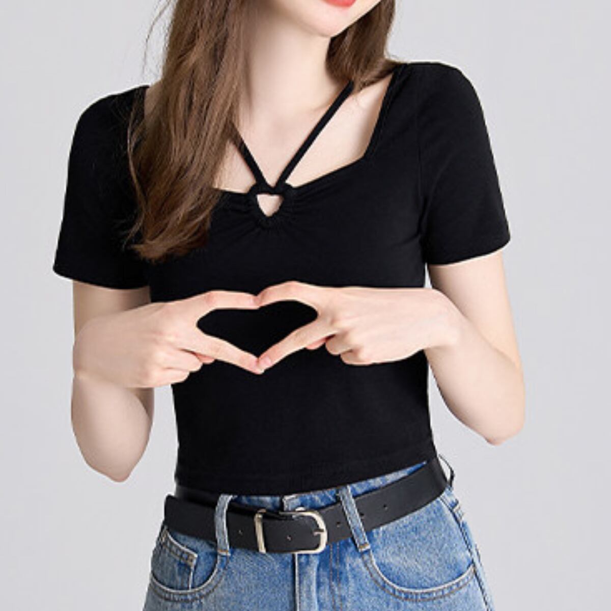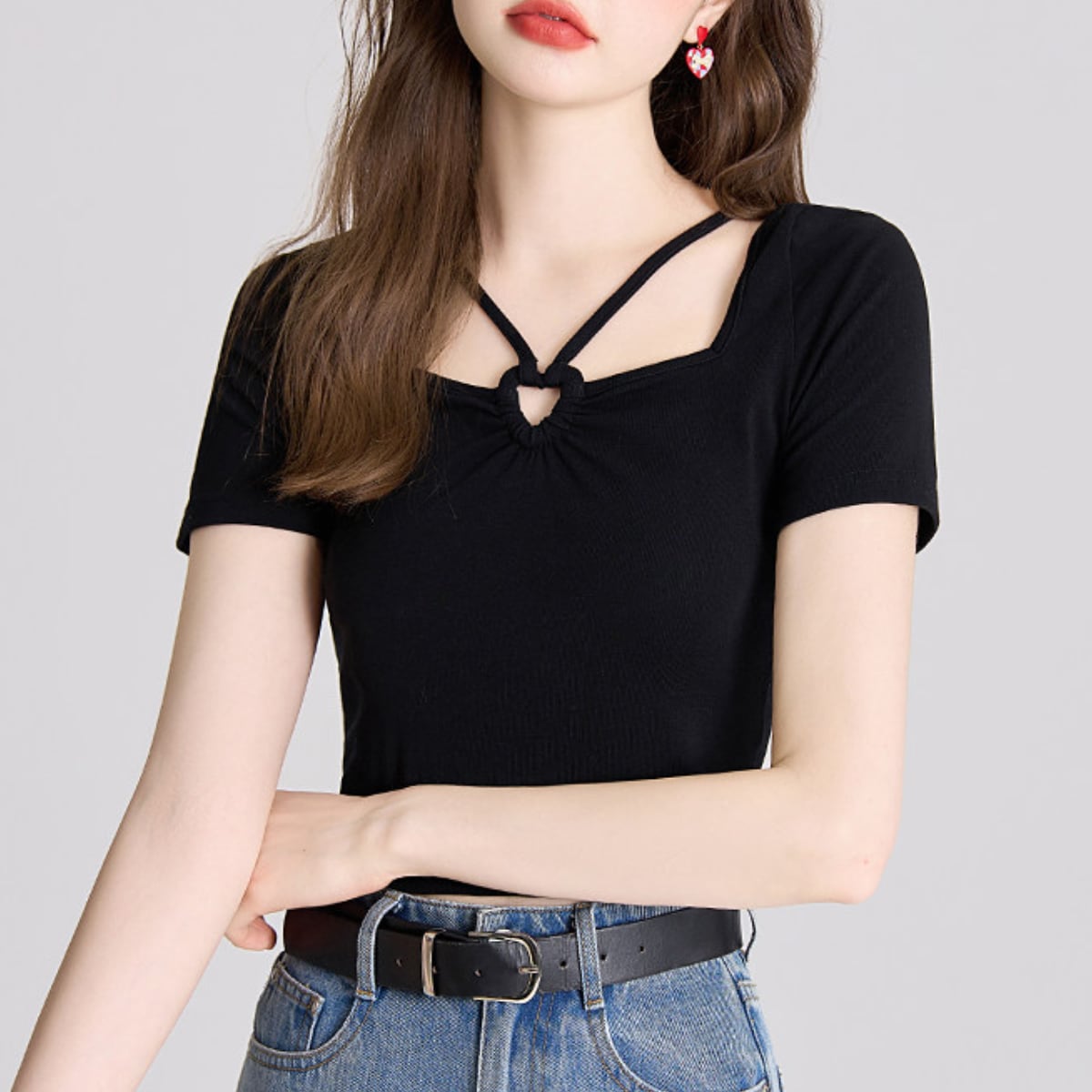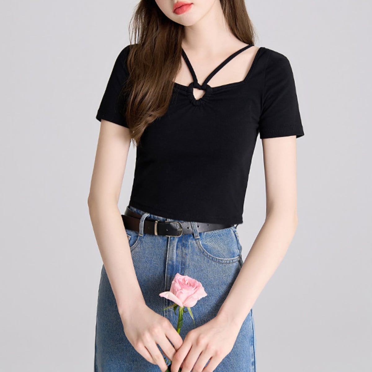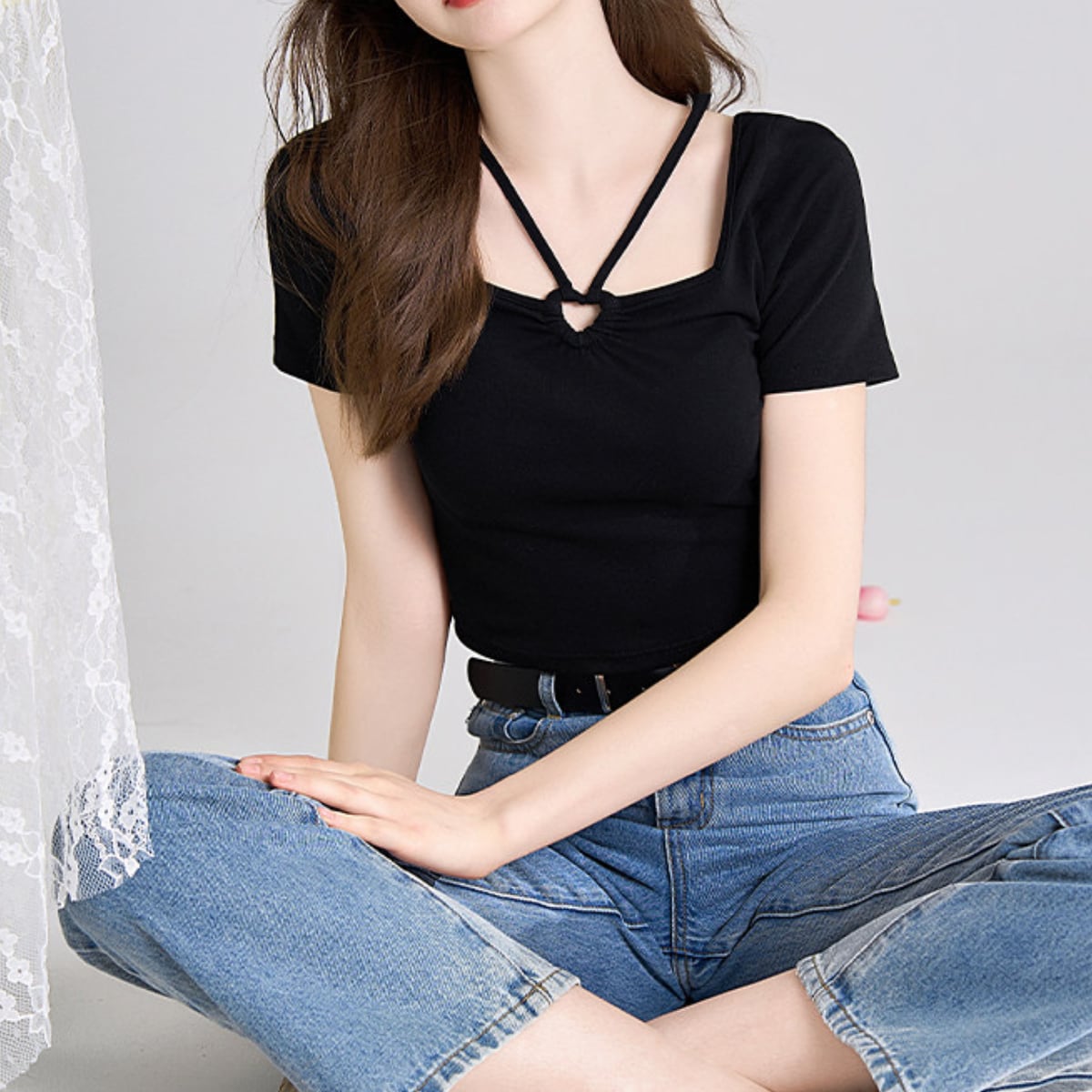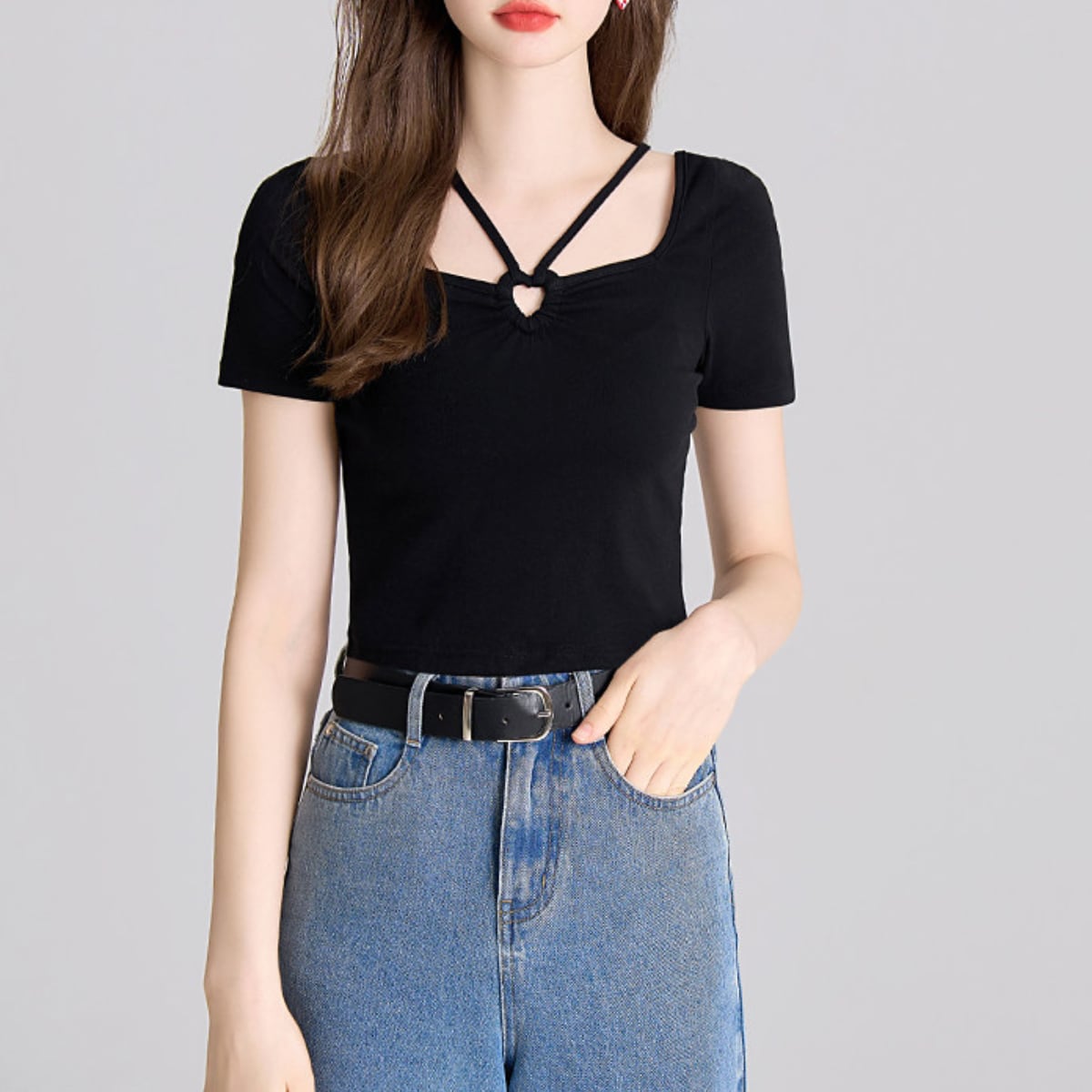 最大の特徴は、フロントにあしらわれた小ぶりのリングパーツとクロスストラップ。トレンドのスクエアネックに繊細なストラップをプラスすることで、お顔周りを華やかに、かつスッキリとした印象に導きます。